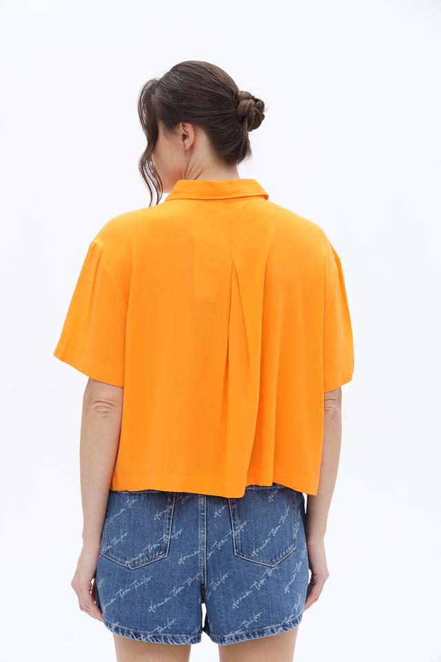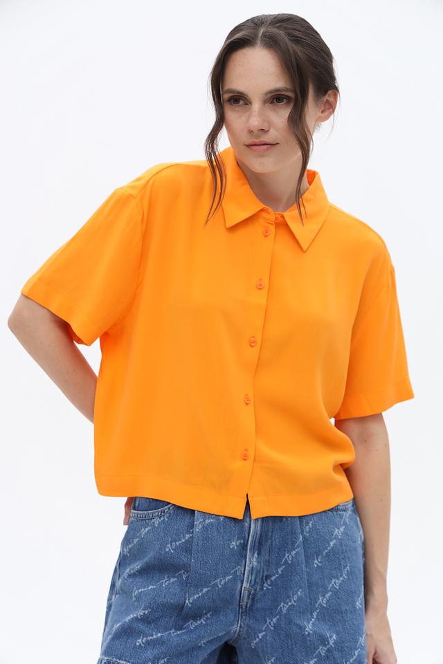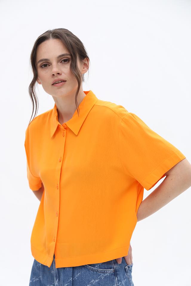 Оранжевая рубашка Tom Tailor свободного кроя с короткими рукавами и классическим воротником. Изготовлена из лёгкой и приятной к телу ткани на основе лиоцелла и вискозы, идеально подходит для создания летних образов. Состав: лиоцел 65%, вискоза 35%