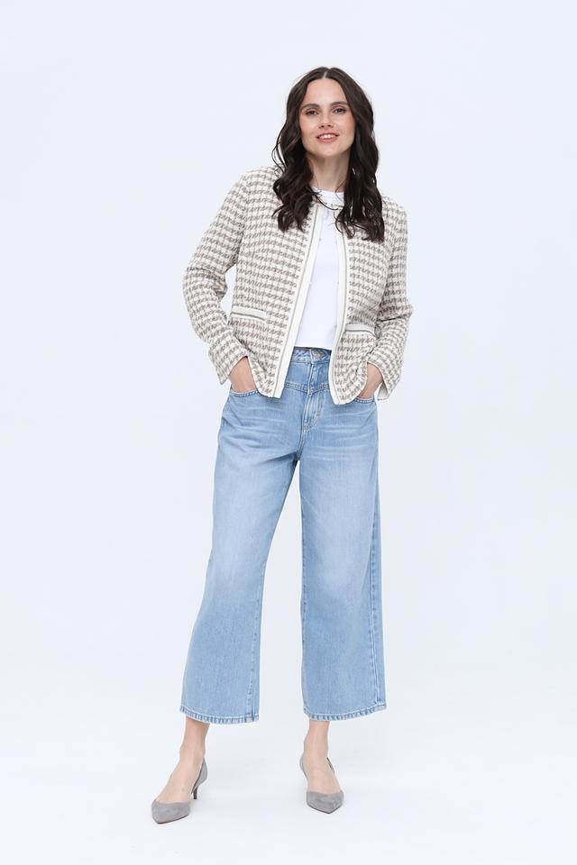Джинсы характеризуются высокой посадкой, что подчеркивает талию и создает элегантный силуэт. Классический пятикарманный дизайн дополнен аккуратными швами и минималистичным декором.