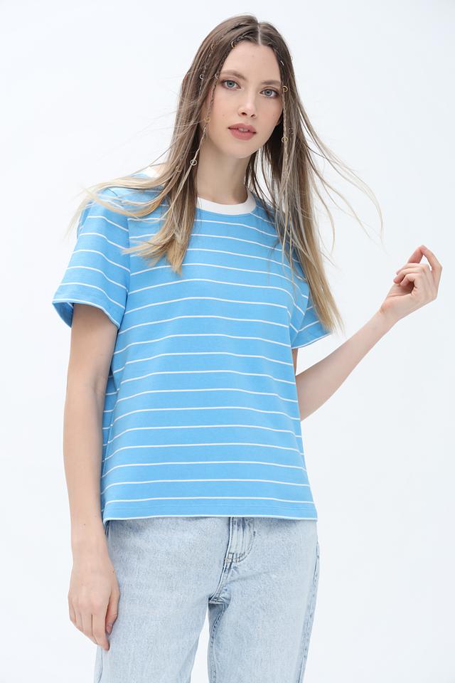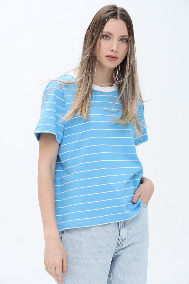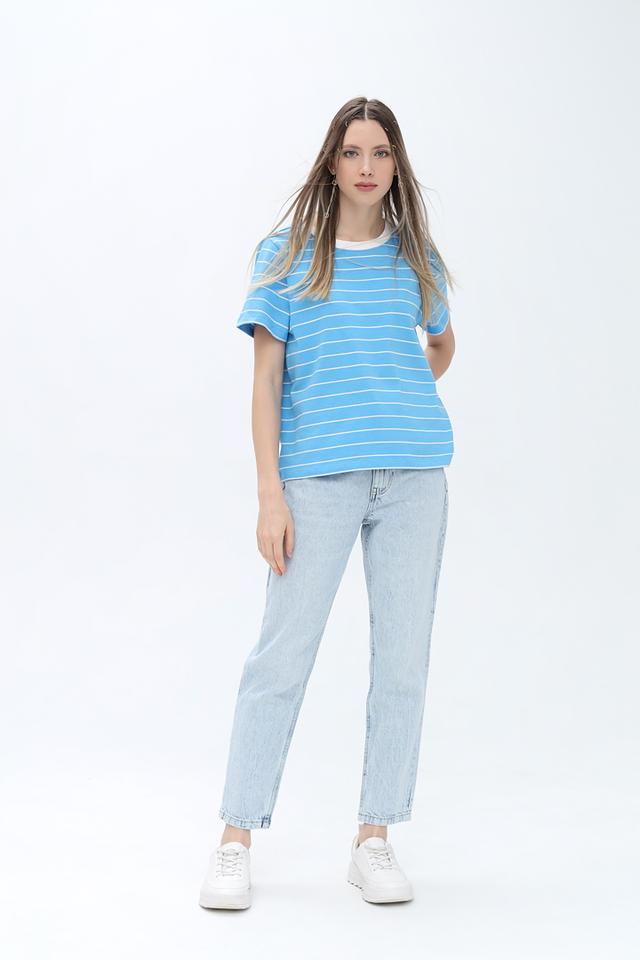 Футболка имеет классический прямой крой и короткие рукава. Голубой цвет с белыми полосками придает ей свежий и летний вид. Округлый вырез горловины оформлен белой окантовкой, что добавляет контрастности.