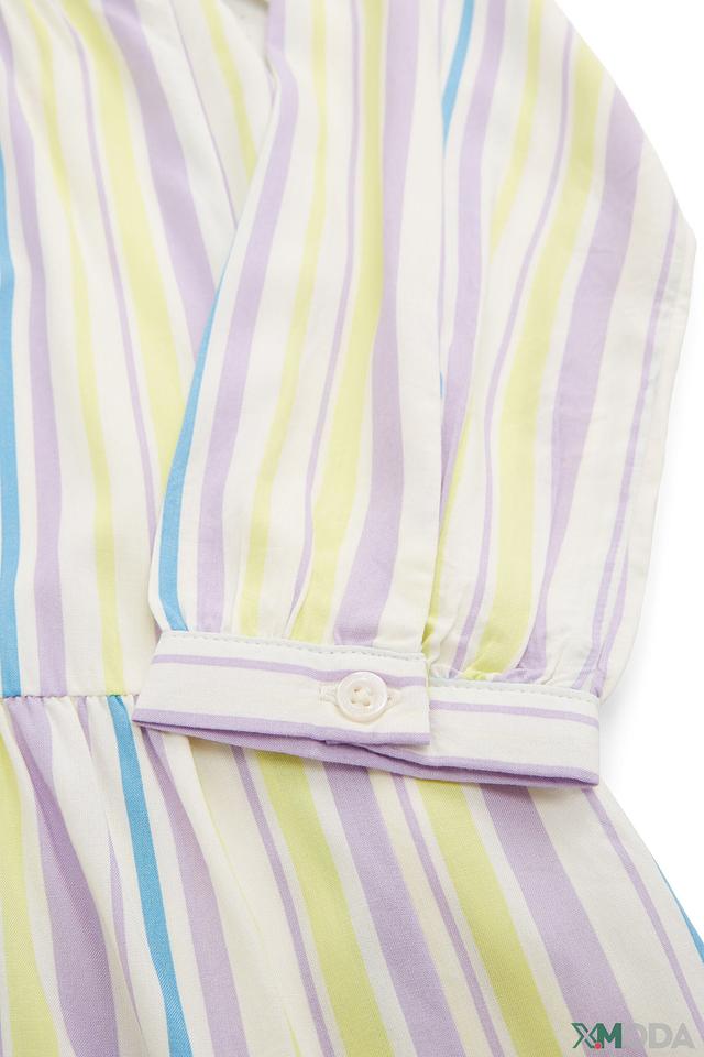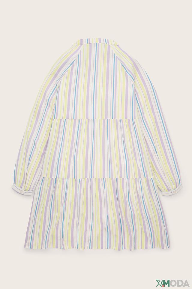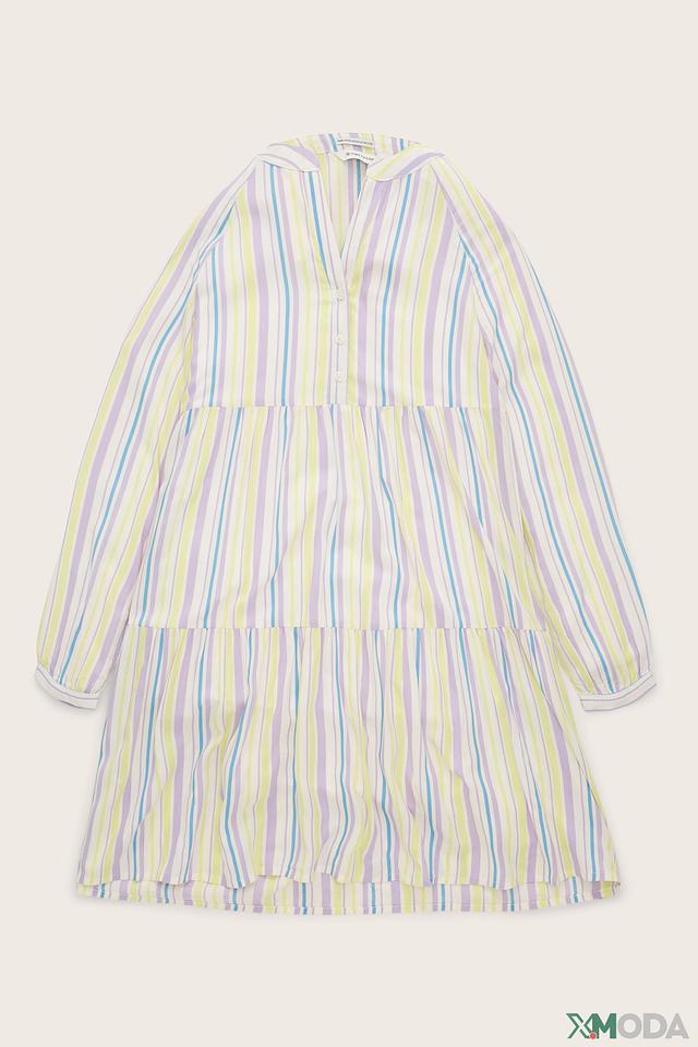 Это очаровательное платье от Tom Tailor станет отличным выбором для юной модницы. Платье выполнено в нежной цветовой гамме с ярким полосатым принтом, сочетающим в себе оттенки лилового, жёлтого и голубого.