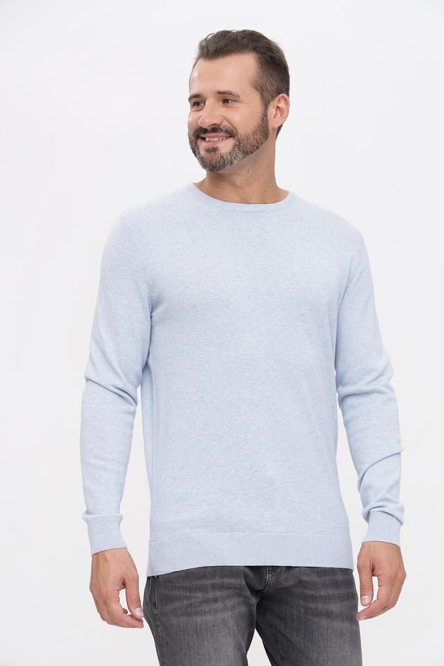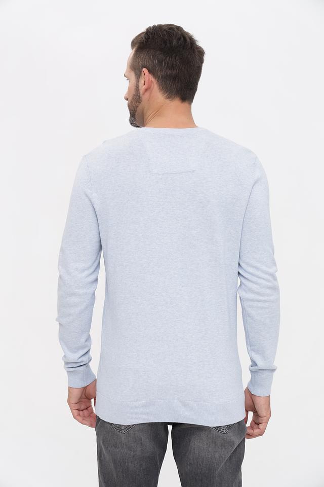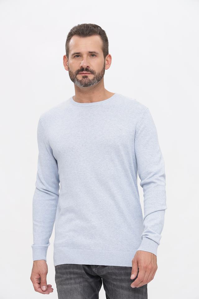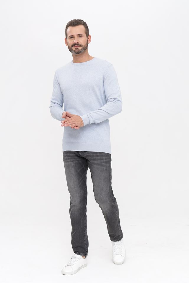 Модель имеет классический крой с круглым вырезом горловины и длинными рукавами. Цвет джемпера – нежный голубой, который легко сочетается с различными элементами гардероба.
