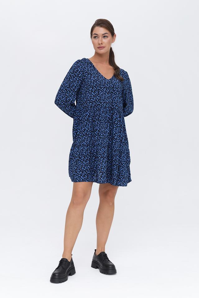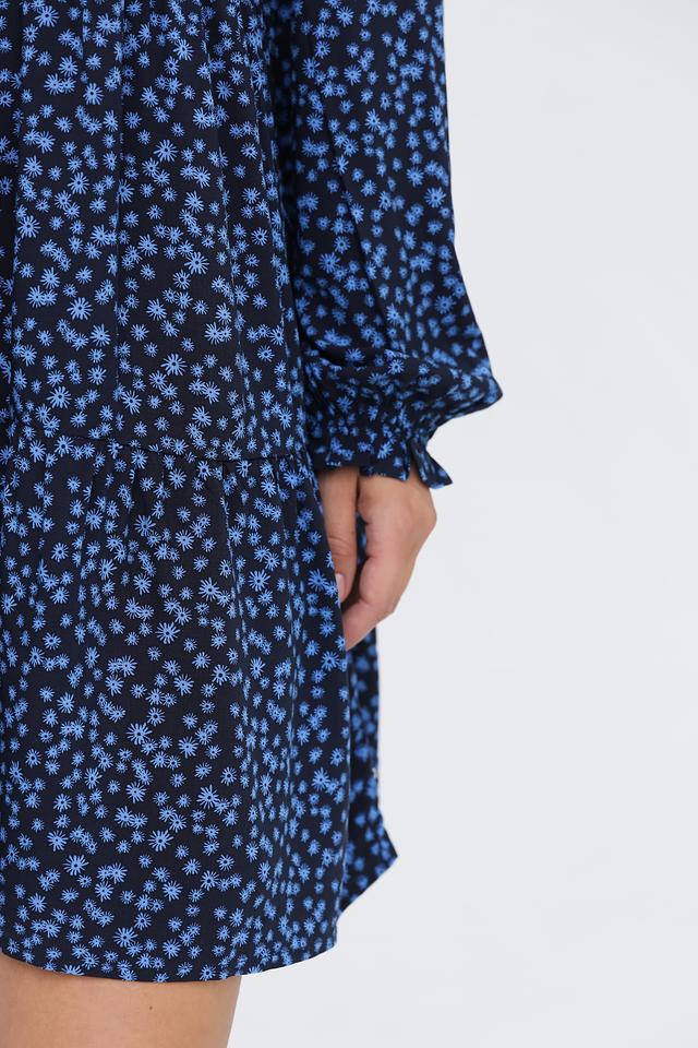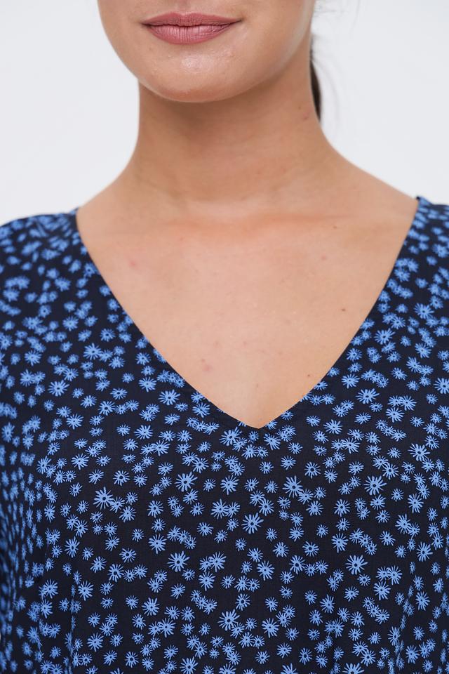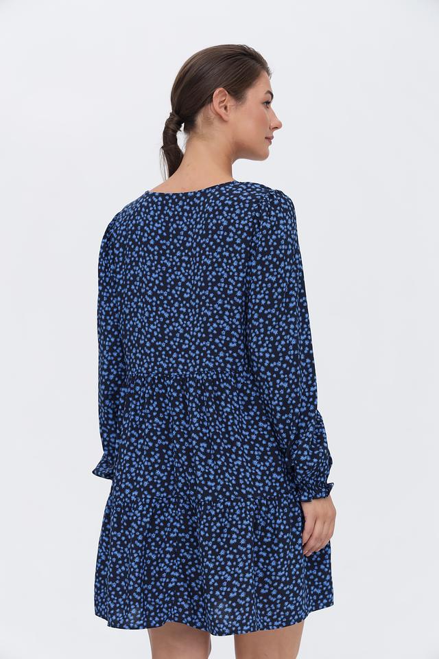 Основной цвет платья – тёмно-синий, который служит идеальным фоном для мелкого цветочного принта голубого цвета. V-образный вырез горловины и длинные рукава с небольшими сборками на манжетах придают платью женственности и элегантности.
