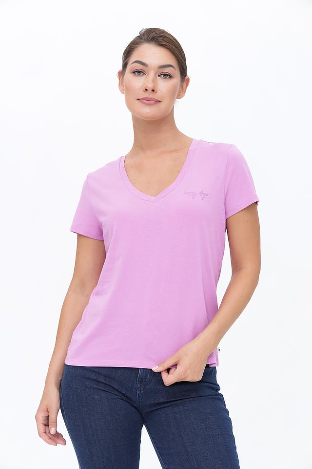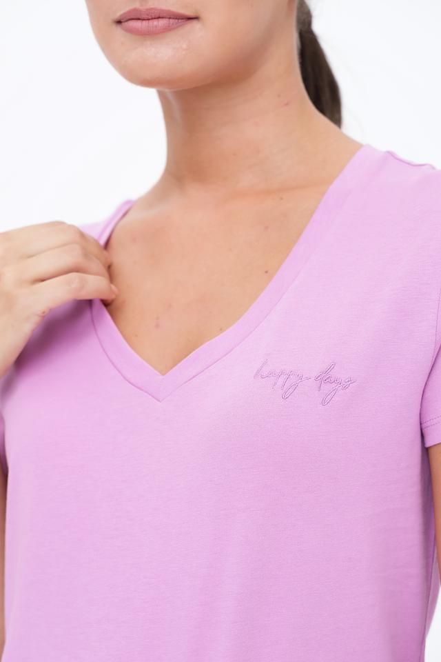 Модель имеет классический крой с короткими рукавами и V-образным вырезом, который визуально удлиняет шею и делает образ более женственным. На груди расположена небольшая вышивка с надписью “happy days”, добавляющая футболке индивидуальности.