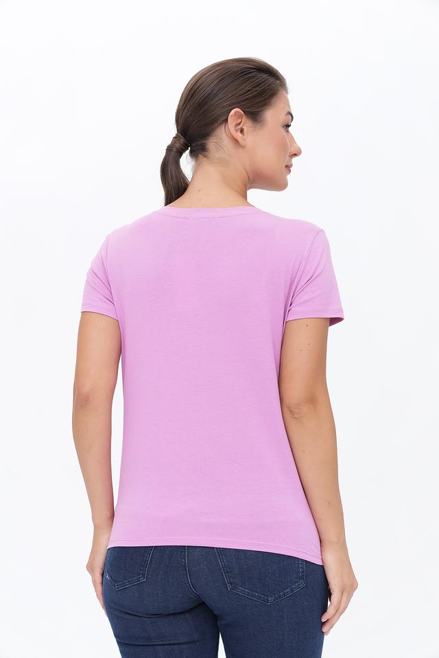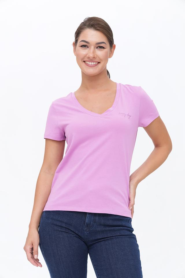 Женская футболка Tom Tailor denim лавандового цвета с V-образным вырезом и небольшим принтом. Изготовлена из 100% хлопка, обеспечивающего комфорт и воздухопроницаемость. Состав: хлопок 100%