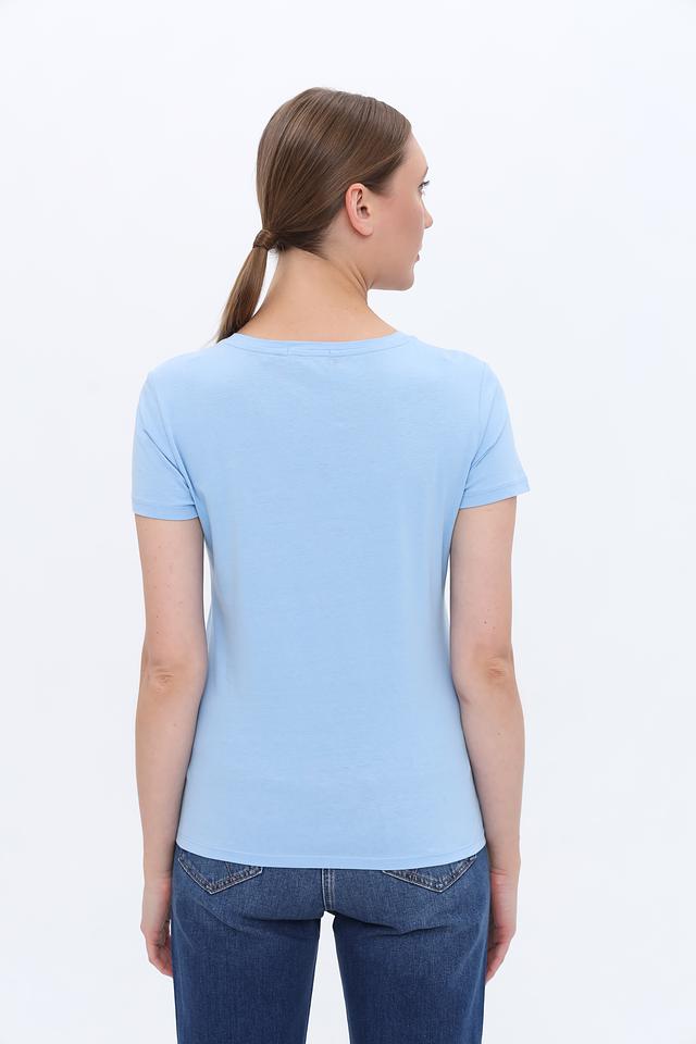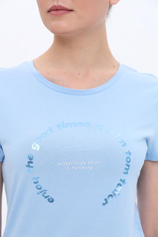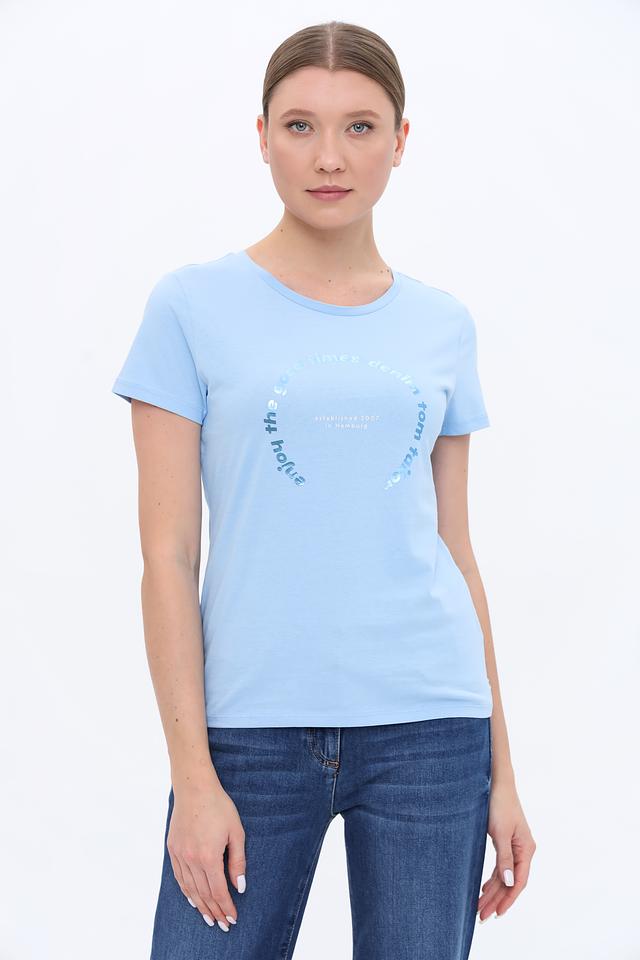 Женская футболка Tom Tailor denim голубого цвета с круглым вырезом и оригинальным принтом. Изготовлена из 100% хлопка, обеспечивающего комфорт и воздухопроницаемость. Стильный и универсальный вариант для повседневного образа. Состав: хлопок 100%