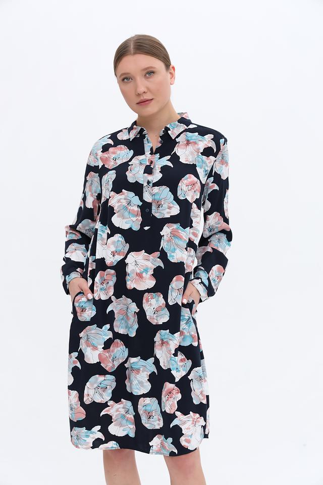 Это стильное платье от бренда Tom Tailor станет прекрасным дополнением к вашему гардеробу. Платье выполнено в темно-синем цвете и украшено изысканным цветочным принтом, выполненным в нежных оттенках розового и голубого.