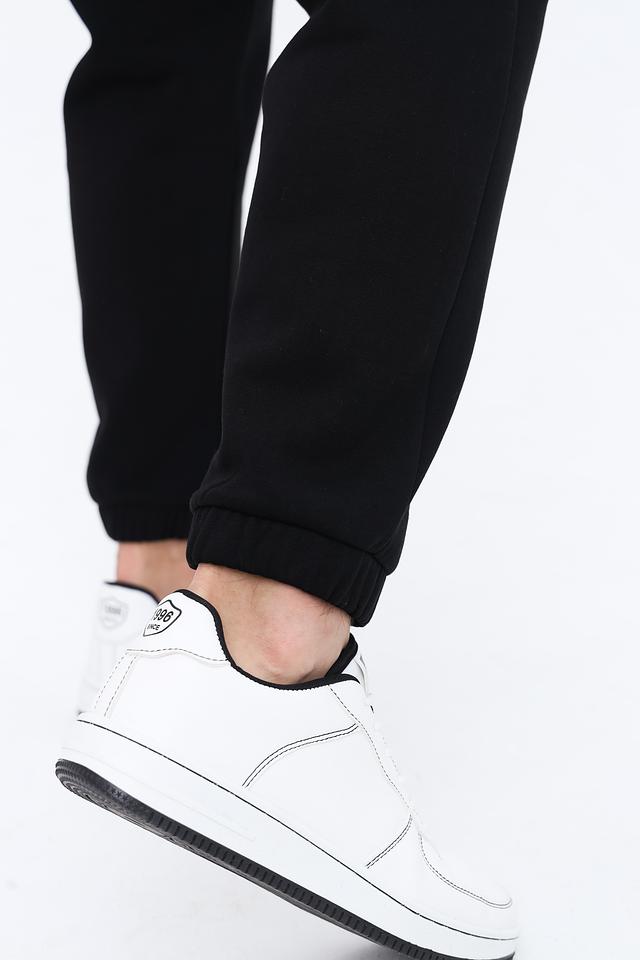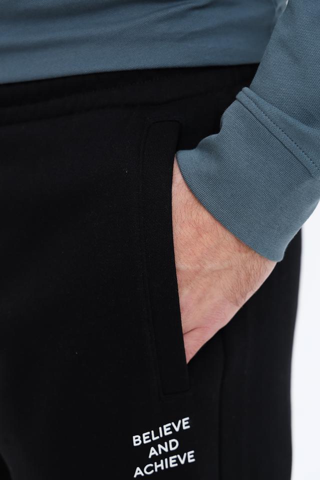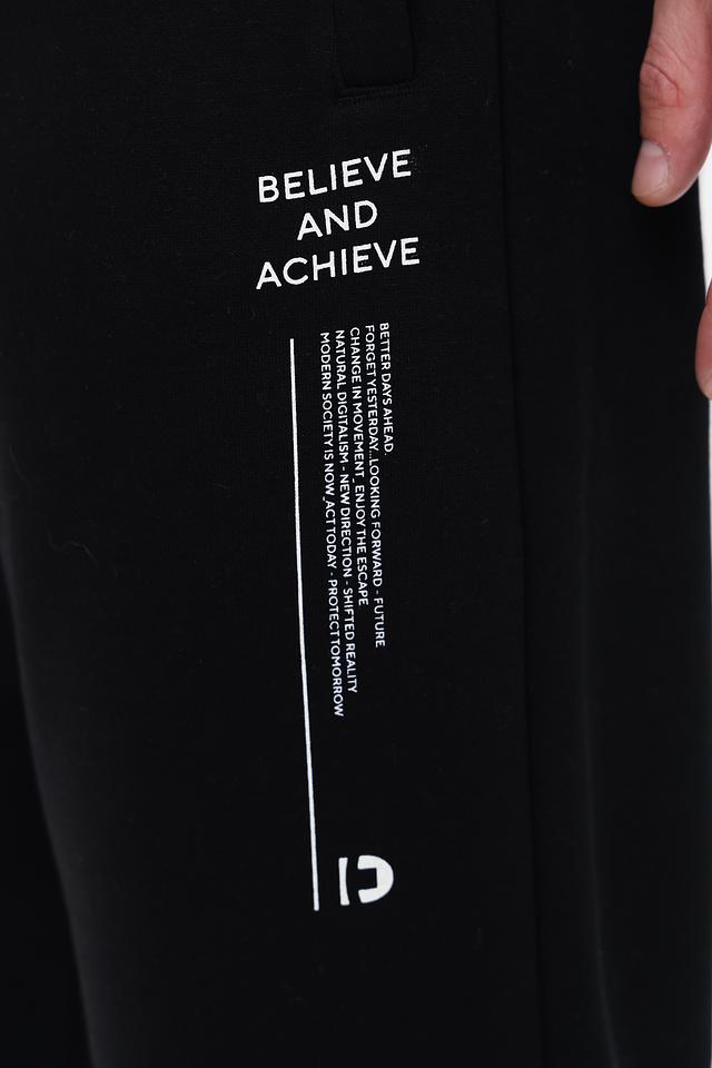 Особенности модели: удобный эластичный пояс с регулируемым шнурком, боковые карманы, манжеты внизу штанин. На левом кармане нанесена надпись "BELIEVE AND ACHIEVE". Данные брюки идеально подойдут для занятий спортом, прогулок или просто для повседневной носки.