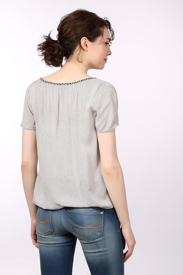 Блуза имеет короткие рукава и свободный крой, который не сковывает движения. Серый цвет с мелким рисунком делает ее универсальной и подходящей для различных стилей.