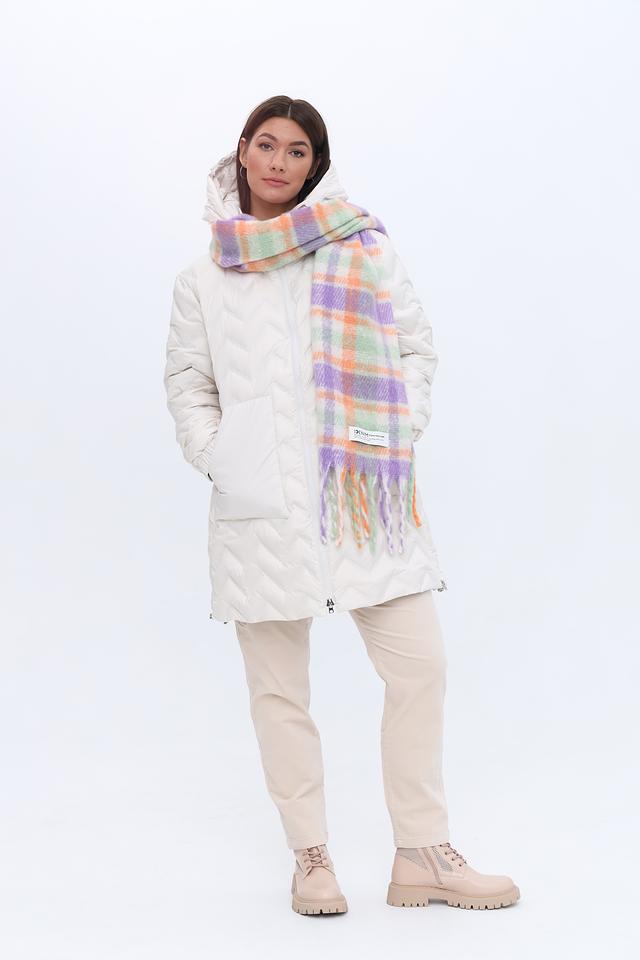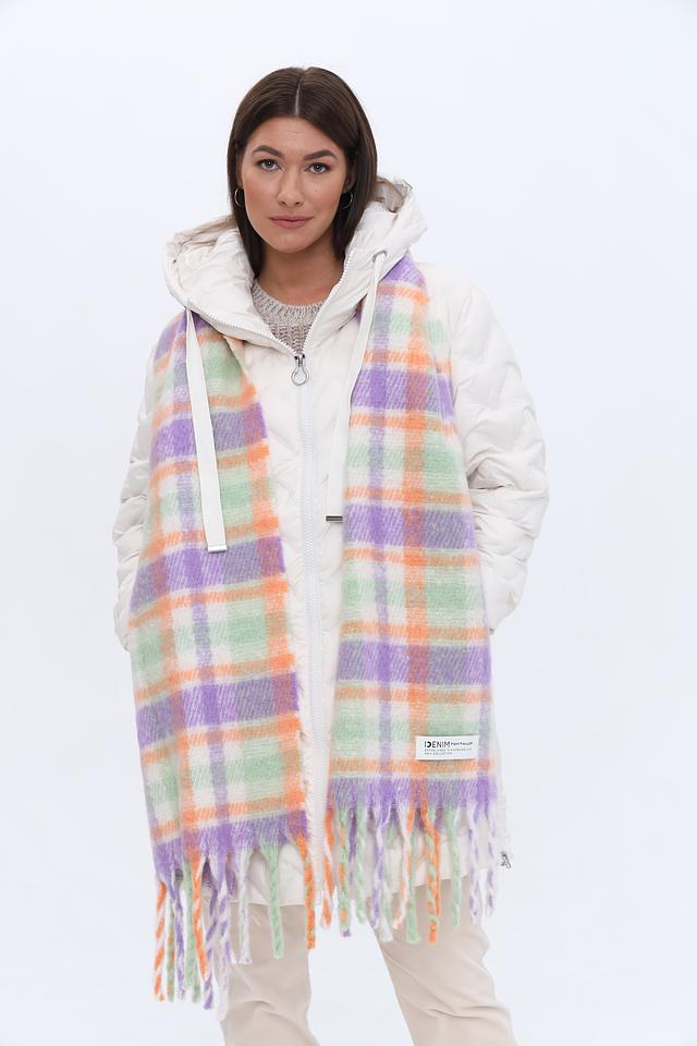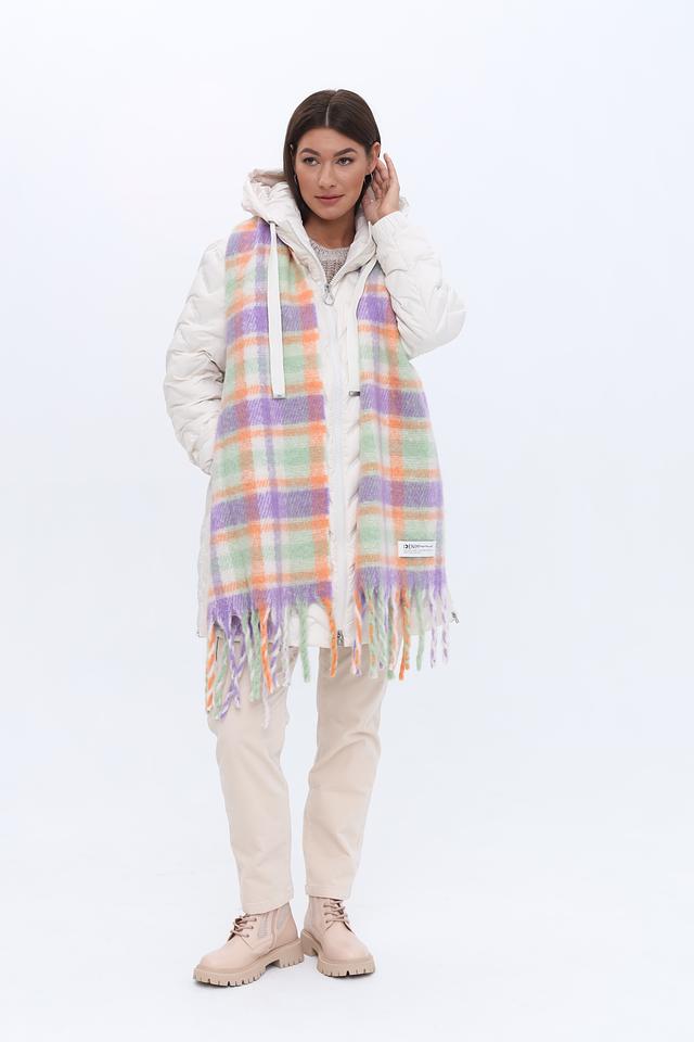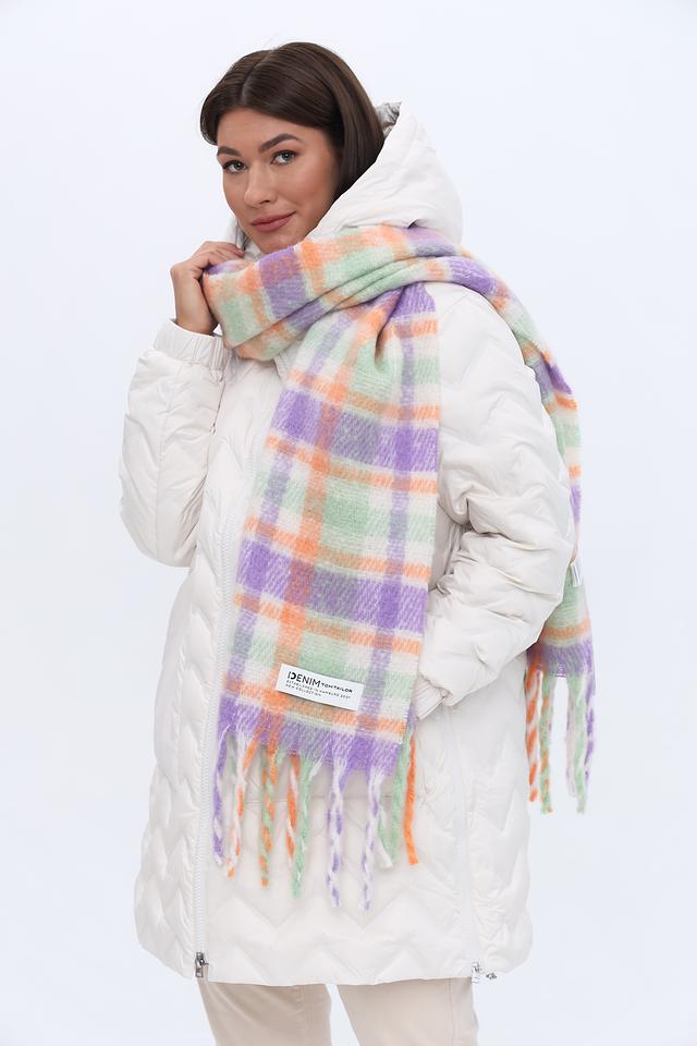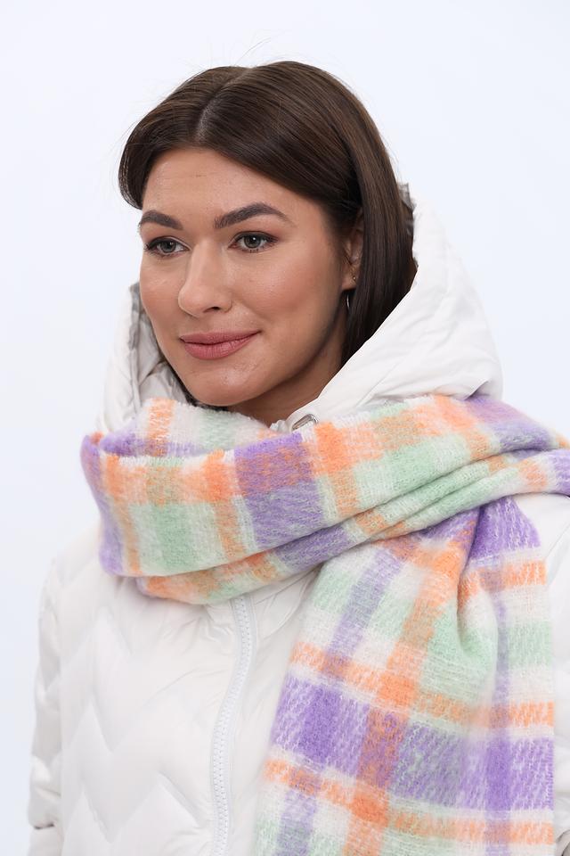 Шарф выполнен в классической клетке, сочетающей в себе оттенки лавандового, оранжевого, зеленого и сиреневого. Такая цветовая гамма делает его универсальным аксессуаром, который легко сочетается с различными элементами гардероба.