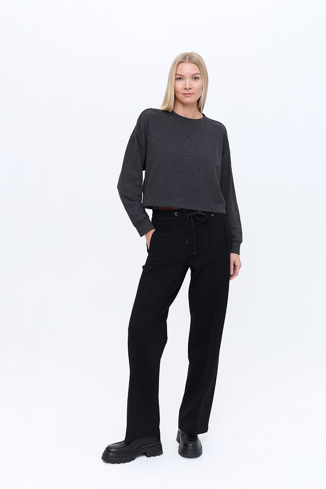 Пуловер имеет круглый вырез горловины и длинные рукава. Укороченная длина делает его актуальным и стильным. Изготовлен из мягкого трикотажа, состоящего из 60% хлопка и 40% полиэстера, что обеспечивает приятные тактильные ощущения и практичность в уходе.