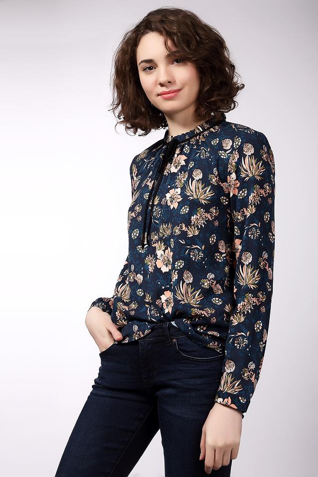 Синяя блуза Tom Tailor с цветочным принтом и завязками на шее. Изготовлена из мягкой вискозы, обеспечивающей комфорт в носке. Отличный выбор для создания стильного и женственного образа. Состав: вискоза 100%