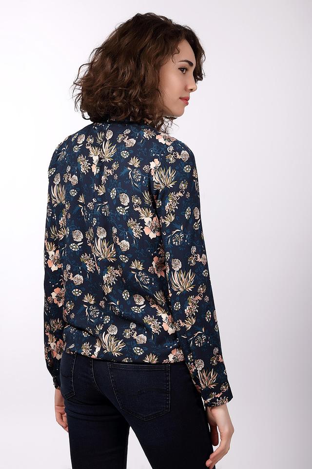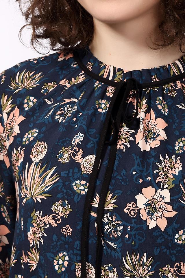 Блуза имеет насыщенный синий цвет, украшенный нежным цветочным принтом в бежевых и светло-зеленых тонах. Особенностью модели являются длинные рукава и V-образный вырез горловины, дополненный тонкими завязками, которые можно повязать бантиком или оставить свободно свисающими.