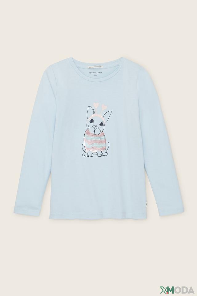 Детский лонгслив Tom Tailor голубого цвета с ярким принтом щенка, украшенным пайетками. Удобный крой и мягкий хлопок обеспечат комфорт в течение дня. Состав: хлопок 100%