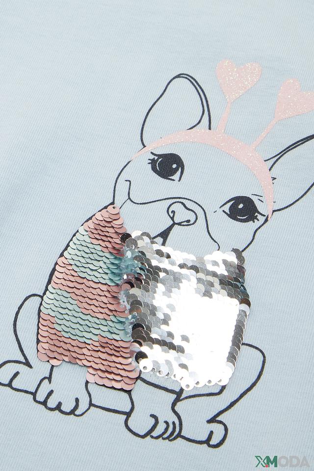 Лонгслив имеет приятный голубой цвет, который легко сочетается с другой одеждой. Главной особенностью является яркий принт в виде милого щенка, декорированного сверкающими пайетками.