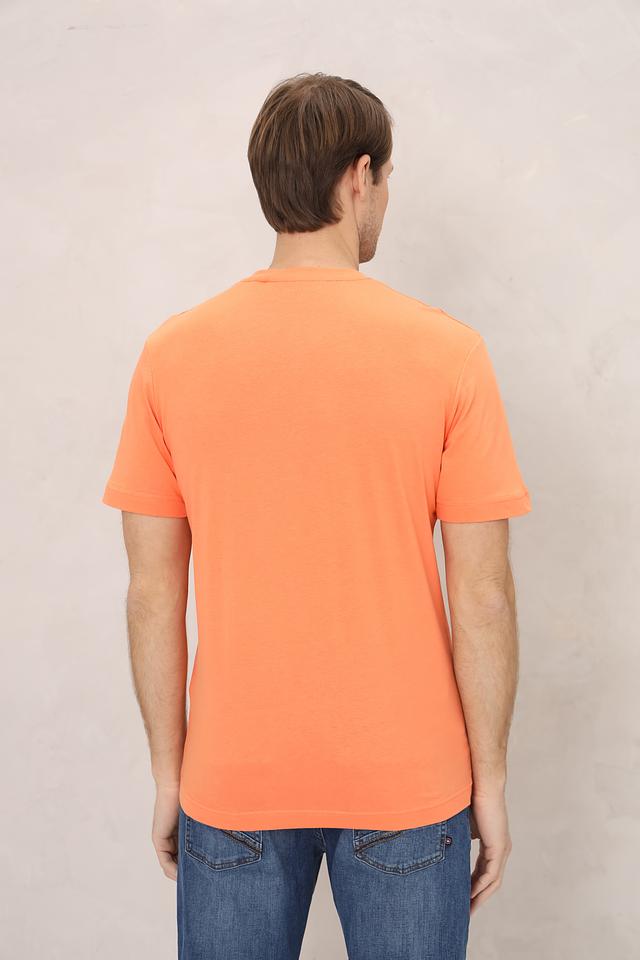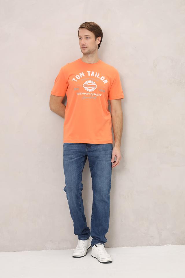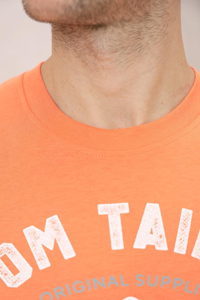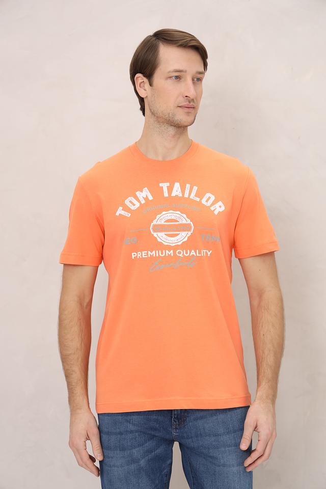 Оранжевая футболка Tom Tailor с круглым вырезом и принтом на груди. Изготовлена из 100% хлопка, обеспечивающего комфорт и воздухопроницаемость. Стильный и удобный вариант для повседневного образа. Состав: хлопок 100%