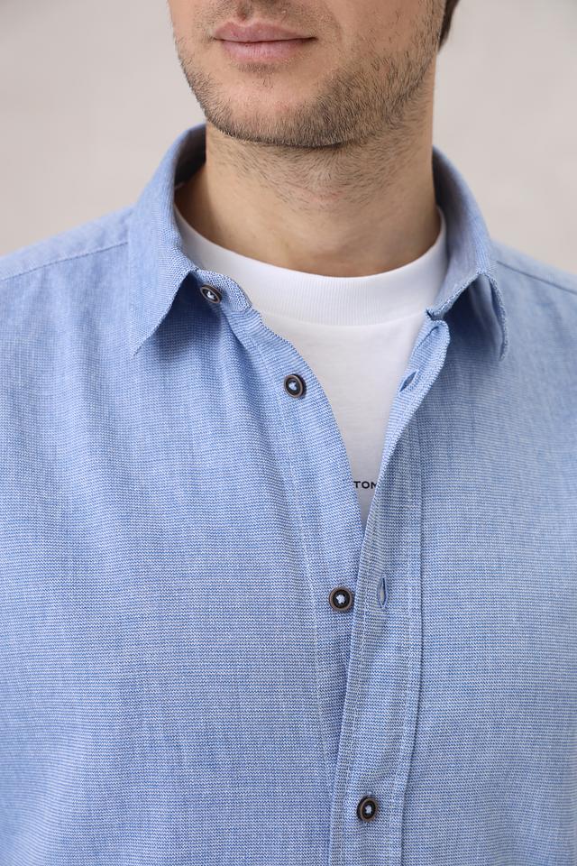 На левой стороне груди расположена небольшая фирменная деталь бренда Tom Tailor. Рукава рубашки имеют манжеты на пуговицах, что позволяет регулировать их длину.
