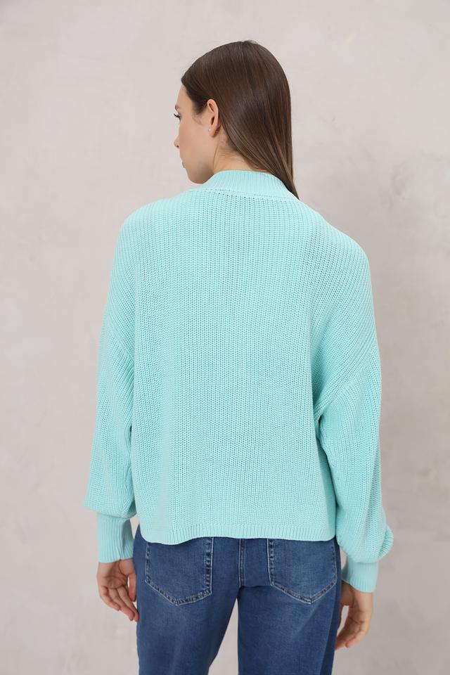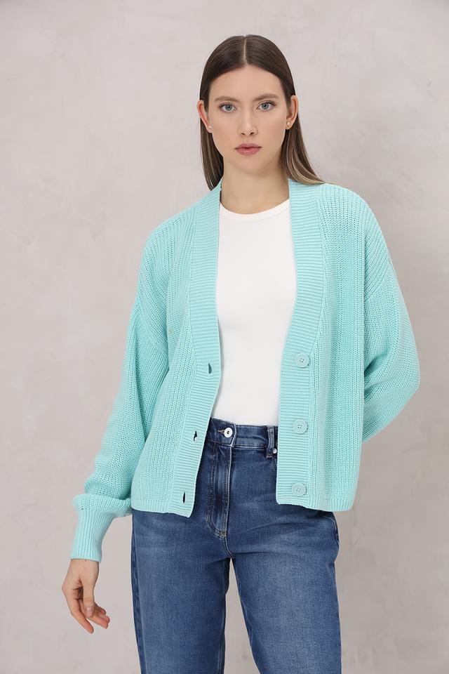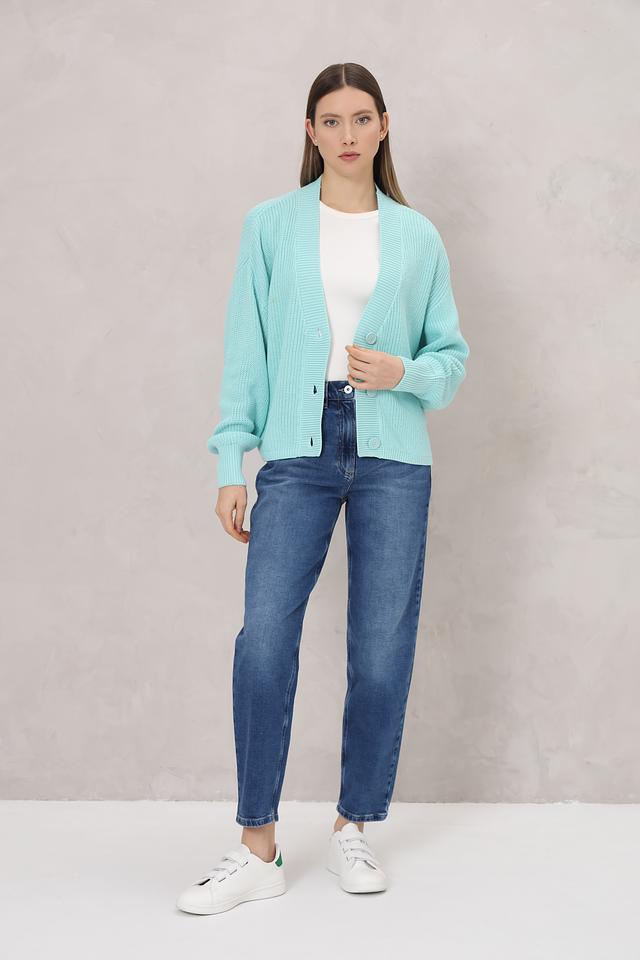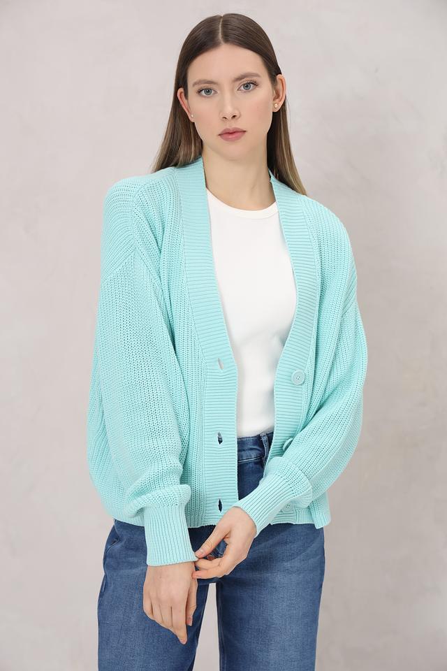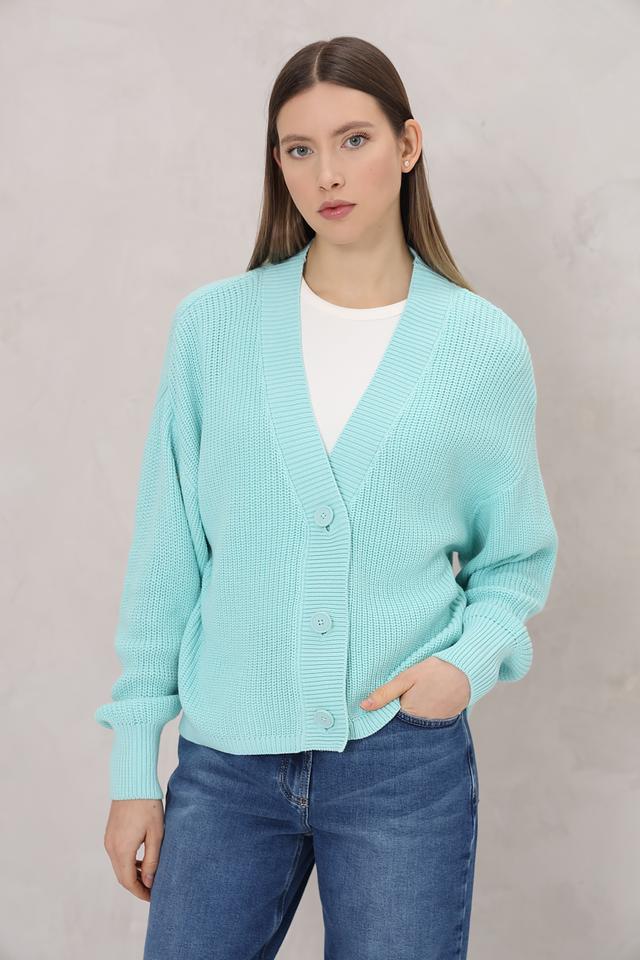Модель имеет классический силуэт с V-образным вырезом и застежкой на пуговицы. Рукава кардигана объёмные, что придает ему современный и модный вид. Цвет кардигана – нежный мятный, который легко сочетается с различными оттенками одежды.