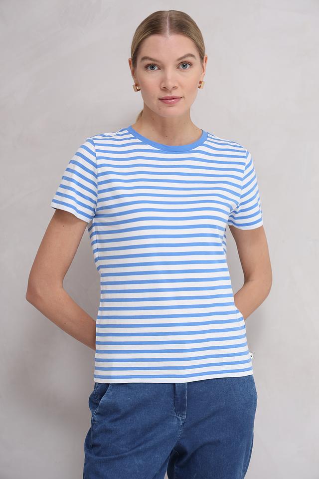 Женская футболка Tom Tailor голубого цвета в классическую полоску. Изготовлена из 100% хлопка, обеспечивающего комфорт и воздухопроницаемость. Отличный выбор для повседневного образа. Состав: хлопок 100%