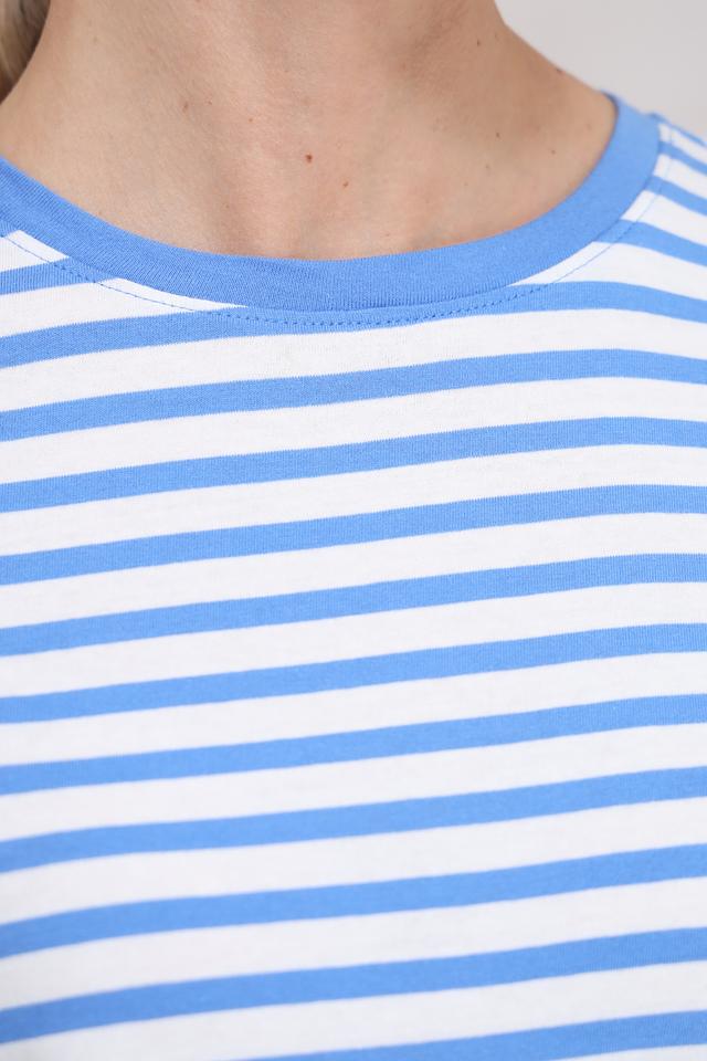 Основной цвет футболки – белый, дополненный тонкими голубыми полосками. Такая расцветка придает изделию свежесть и легкость. Футболка выполнена из высококачественного 100% хлопка, что обеспечивает максимальный комфорт при носке и позволяет коже дышать.