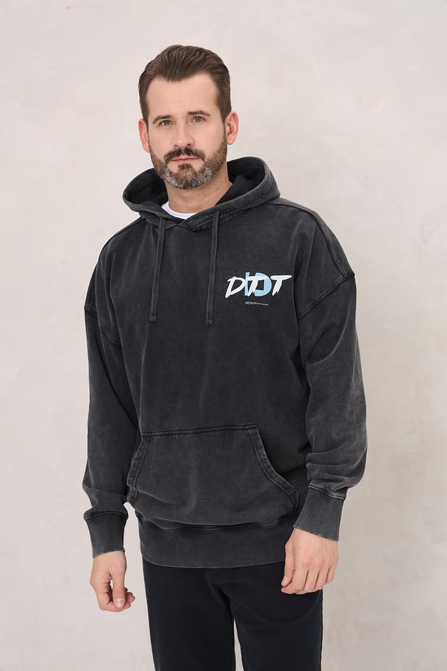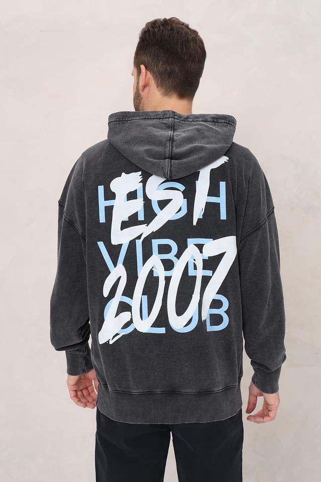 Модель имеет свободный крой, который не сковывает движения. Эффект washed denim придает толстовке винтажный вид. Спереди на груди расположен яркий белый принт с логотипом бренда, а на спине – крупная надпись "HASH VIBE 2007" в голубых тонах.