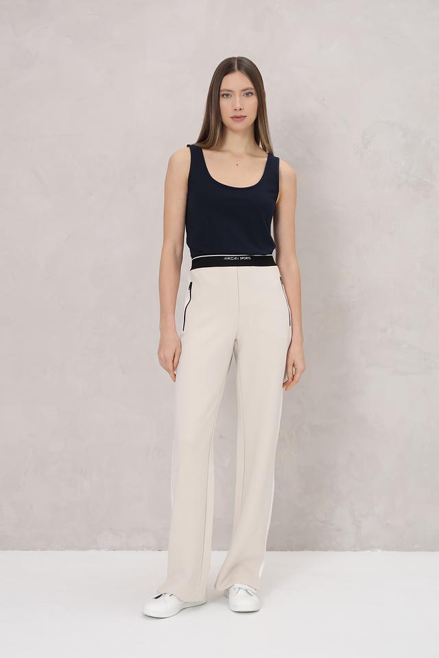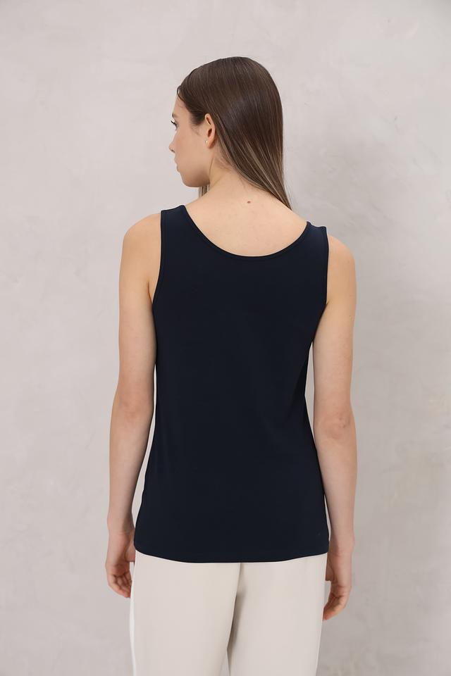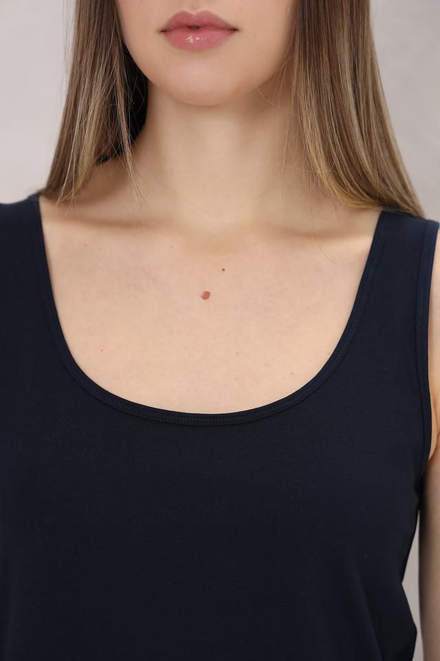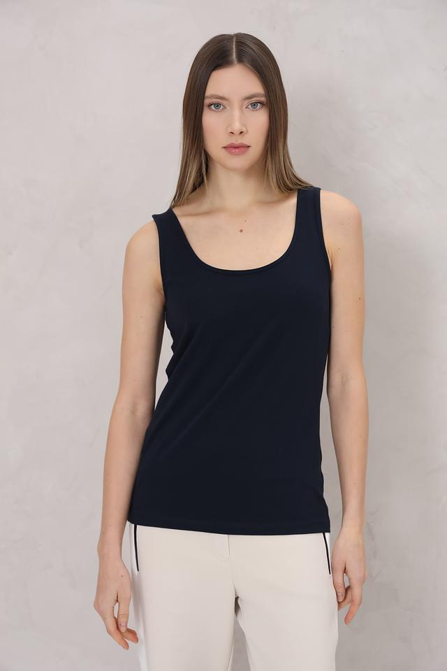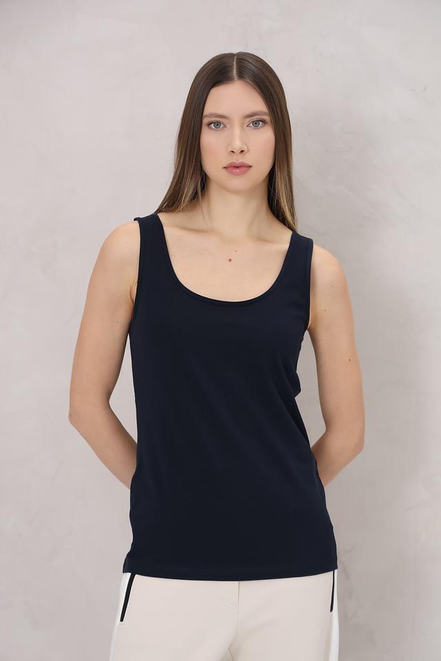Топ имеет прямой крой и круглый вырез горловины, что обеспечивает комфортную посадку по фигуре. Изготовлен из высококачественного хлопка с добавлением эластана, благодаря чему он приятен к телу, хорошо держит форму и не сковывает движений.