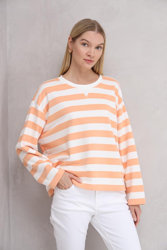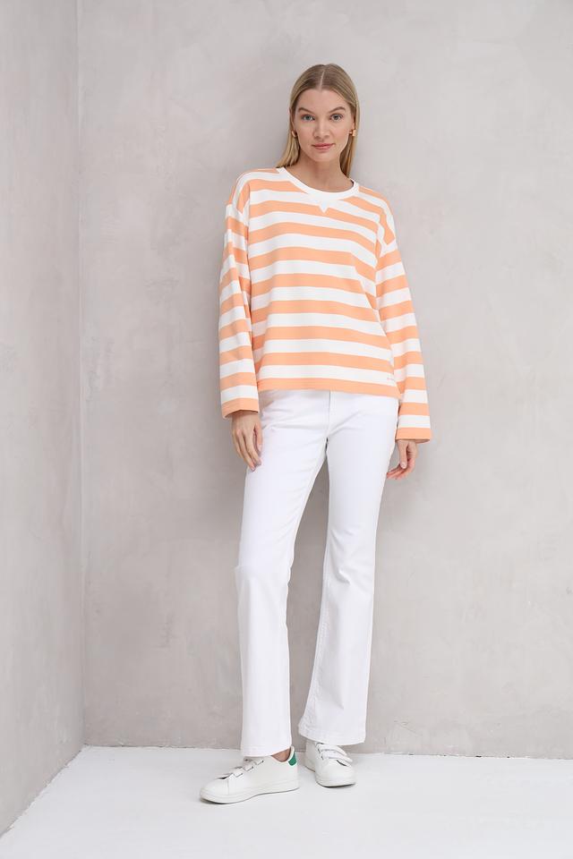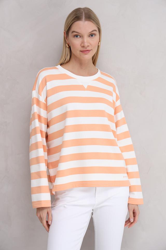 Этот женский пуловер от Tom Tailor выполнен в классическом стиле с горизонтальной полоской. Сочетание персикового и белого цветов делает его ярким и привлекательным элементом гардероба.
