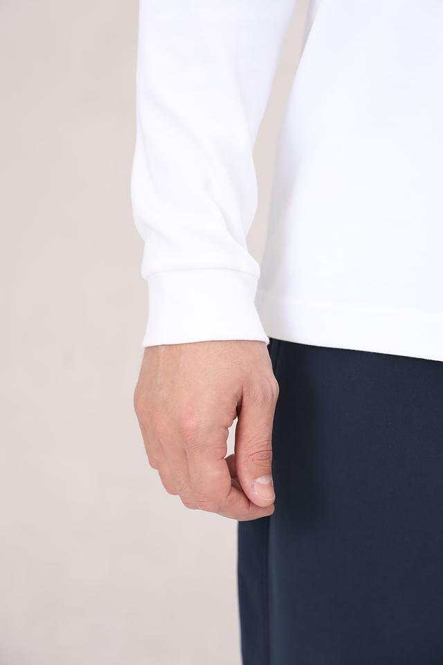 Лонгслив имеет прямой крой, обеспечивающий свободу движений. Изготовлен из высококачественного 100% хлопка, что гарантирует мягкость, комфорт и воздухопроницаемость. На груди расположен небольшой логотип бренда, выполненный в контрастных цветах – синем и красном.