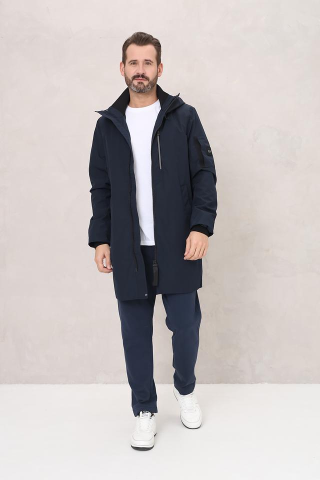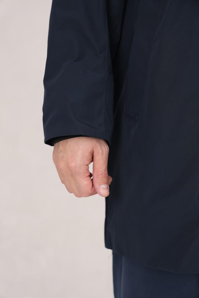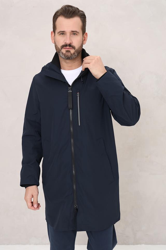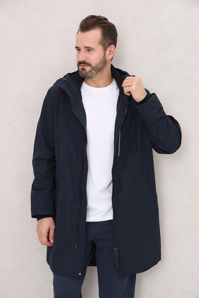 Плащ имеет тёмно-синий цвет, прямой крой и длину до середины бедра. Он застегивается на молнию с ветрозащитной планкой, что обеспечивает дополнительную защиту от ветра и холода. Капюшон регулируется шнурками, позволяя адаптировать его под ваши нужды.