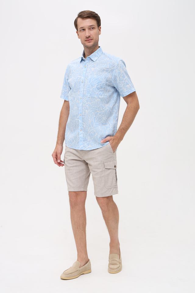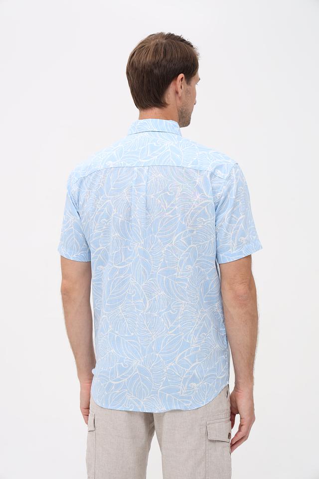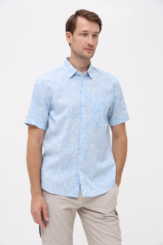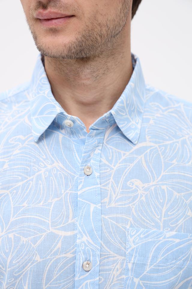 Рубашка имеет классический крой, короткие рукава и воротник с пуговицами. Её отличает яркий и запоминающийся принт с изображением листьев, выполненный в светлых тонах на голубом фоне. Эта рубашка идеально подходит для создания непринужденных летних образов.