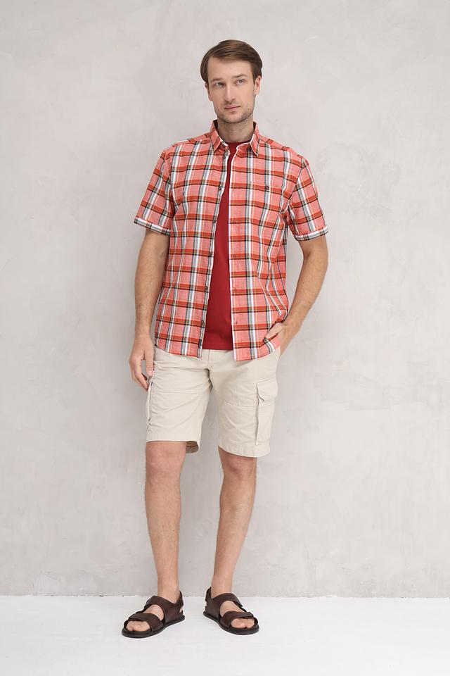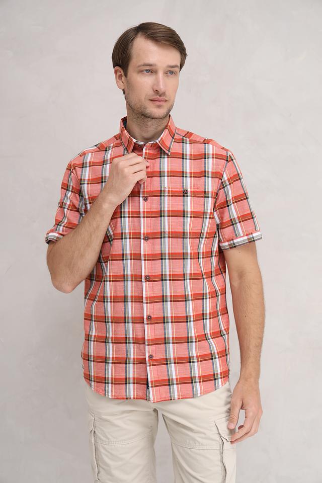 Рубашка имеет классический крой с короткими рукавами и стандартным воротником. Яркий клетчатый принт в оранжево-красной гамме с добавлением белых и серых полос делает эту рубашку заметной и стильной.