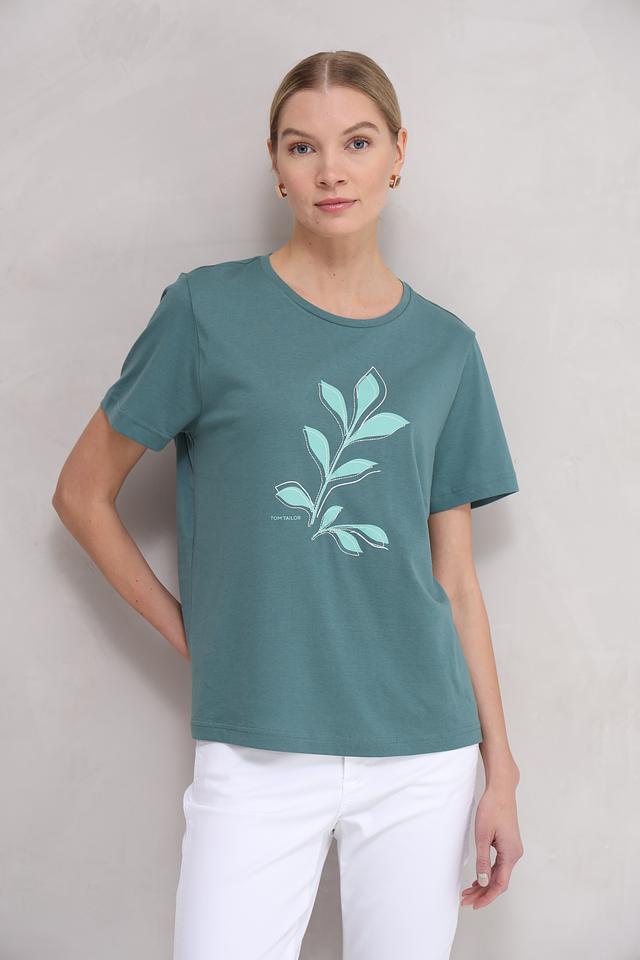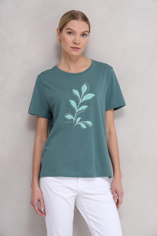 Женская футболка Tom Tailor мятного цвета с оригинальным принтом в виде ветки. Изготовлена из 100% хлопка, обеспечивающего комфорт и воздухопроницаемость. Стильный и удобный вариант для повседневного образа. Состав: хлопок 100%