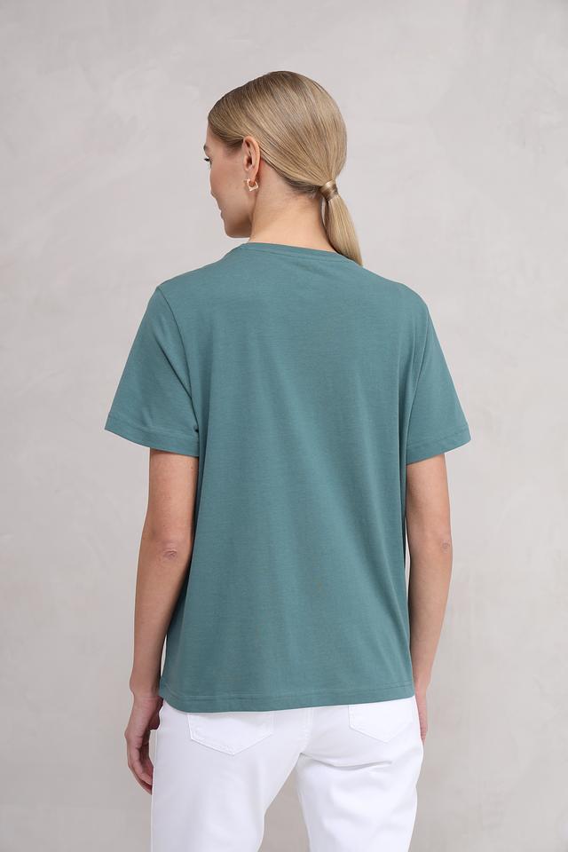 Цвет футболки – приглушенный мятный, который легко сочетается с различными элементами одежды. Эта футболка идеально подойдет для создания повседневных образов, а также для активного отдыха. Она прекрасно сочетается с джинсами, шортами, юбками и другими предметами гардероба.