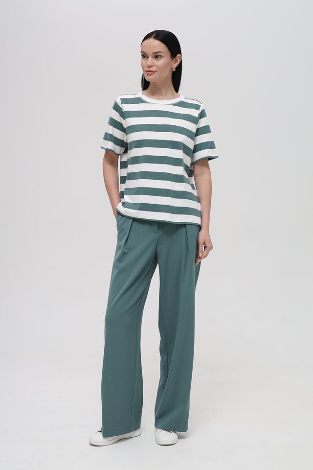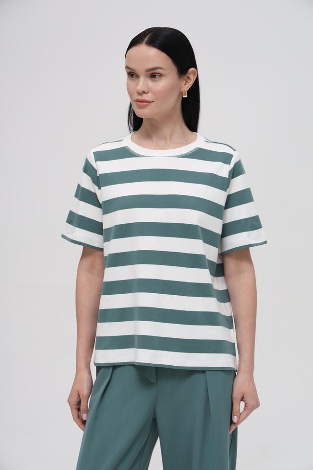 Основной особенностью футболки является горизонтальная полоска, сочетающая в себе насыщенный зеленый и чистый белый цвета. Такое сочетание делает футболку универсальной и легко сочетаемой с различными элементами гардероба.