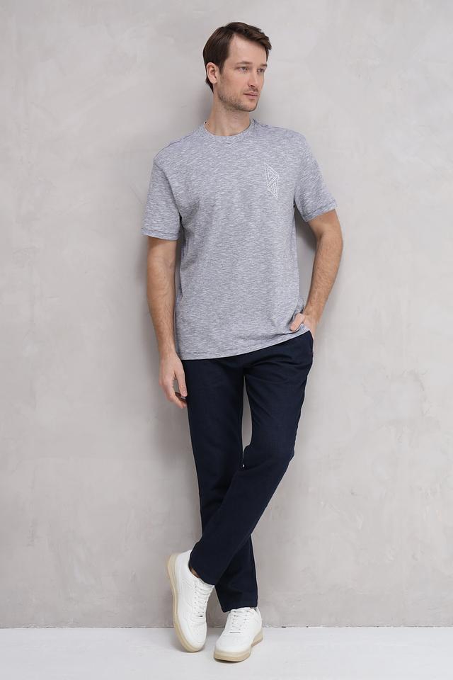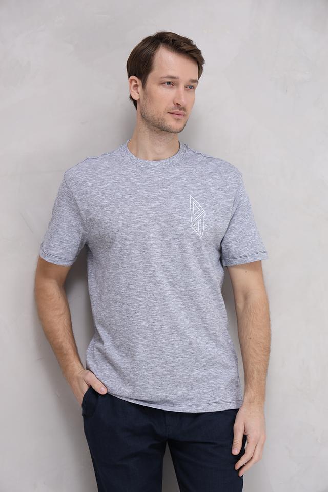 Футболка имеет классический крой с короткими рукавами и круглым вырезом горловины. На груди расположен небольшой геометрический принт, который добавляет стильный акцент. Текстура ткани слегка меланжевая, что придает футболке более интересный вид.
