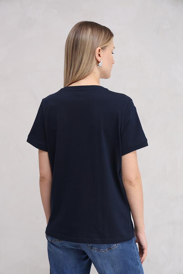 Тёмно-синий цвет футболки делает её практичной и подходящей для любого случая. Она станет незаменимой вещью в вашем гардеробе, позволяя создавать стильные и комфортные образы.