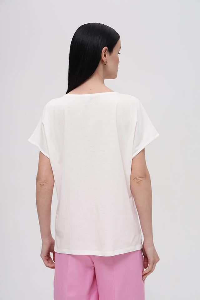 Модель имеет свободный крой, короткие рукава и круглый вырез горловины. Футболка выполнена из высококачественного материала – 50% хлопка и 50% модала, что обеспечивает комфорт и приятные ощущения при носке.