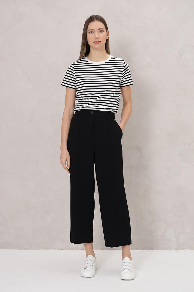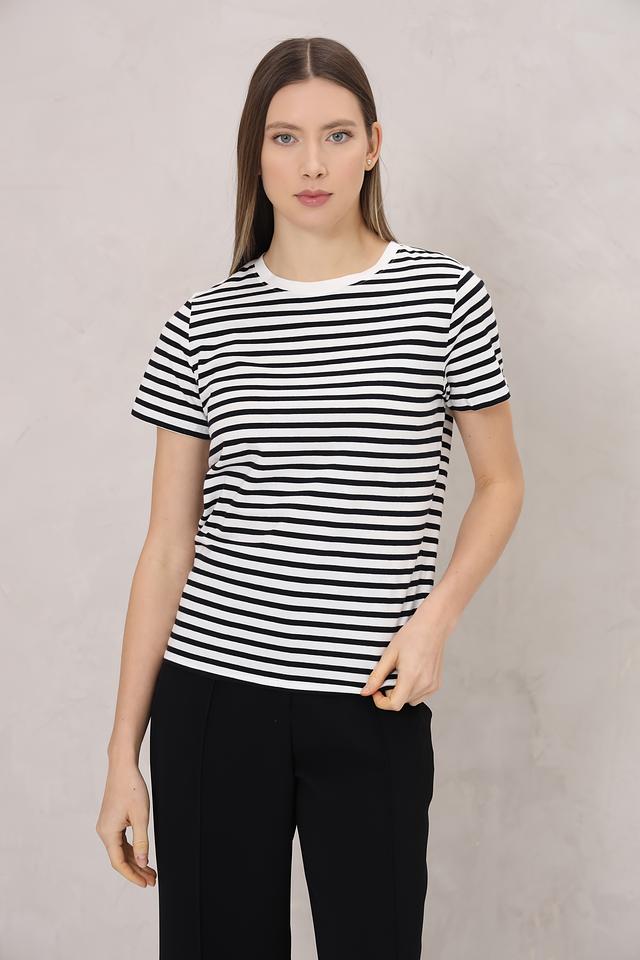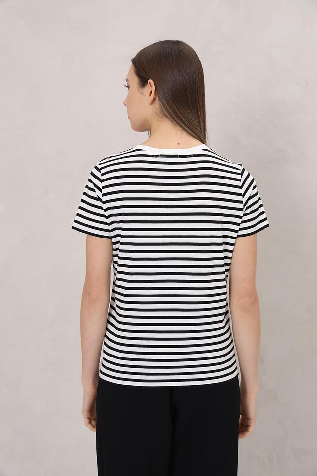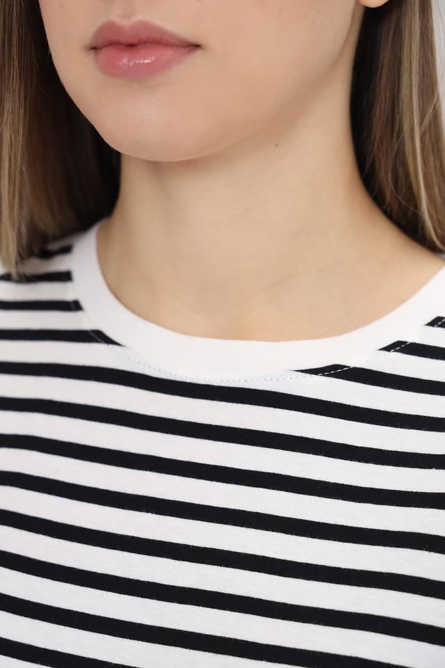 Женская футболка Tom Tailor выполнена в классической чёрно-белой полоску. Модель из 100% хлопка обеспечивает комфорт и удобство в повседневной носке. Идеально сочетается с джинсами и брюками. Состав: хлопок 100%