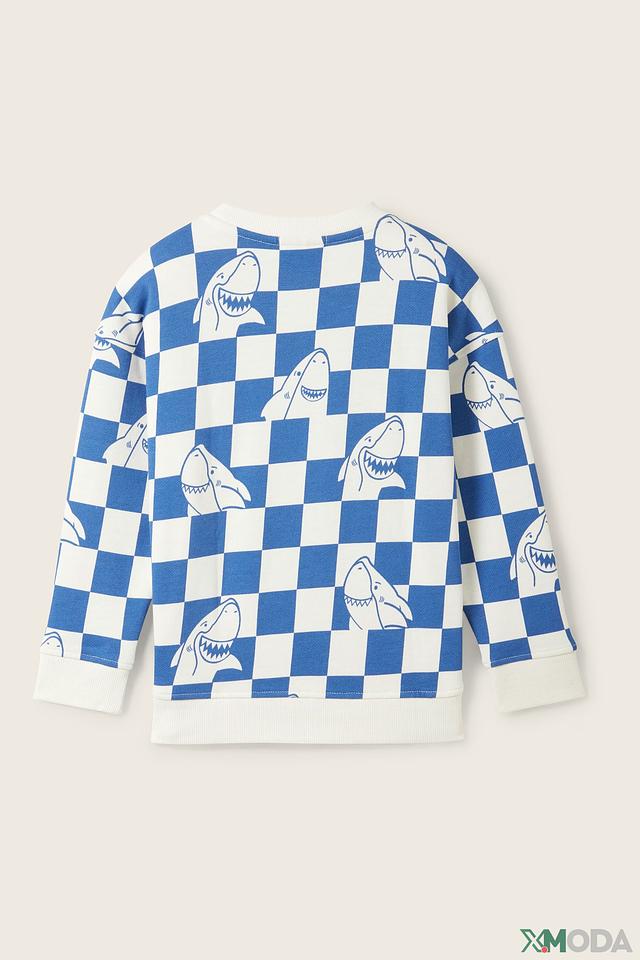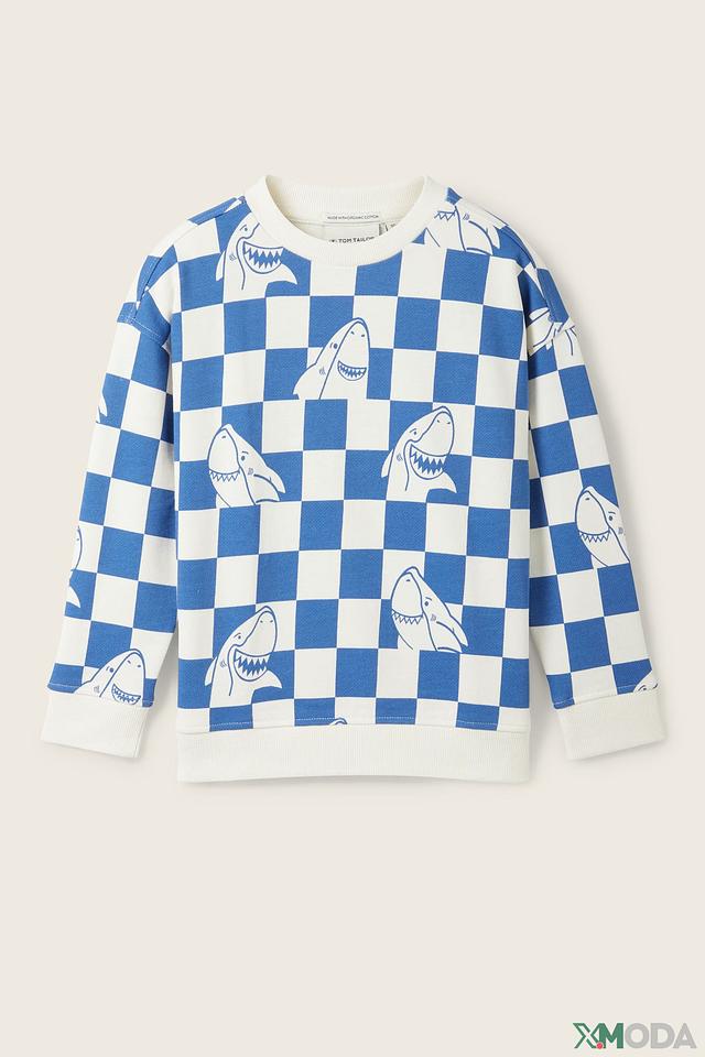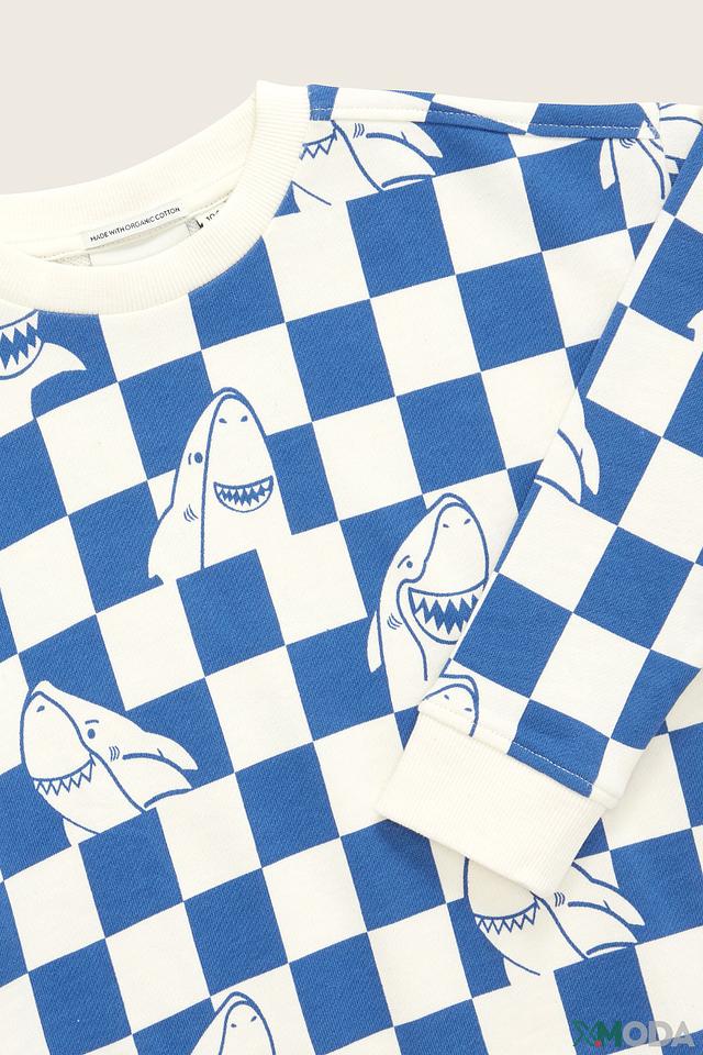 Свитшот имеет удобный крой, не сковывающий движений, и круглый вырез горловины. По всей поверхности изделия расположен забавный принт с изображением акул, выполненный в шахматном порядке. Рукава и нижний край свитшота оформлены эластичными манжетами, обеспечивающими плотное прилегание.