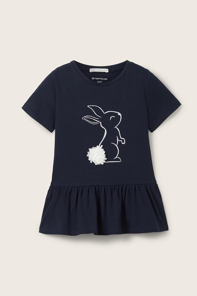Синяя футболка Tom Tailor для девочки с очаровательным принтом зайчика. Изготовлена из 100% хлопка, обеспечивая комфорт и удобство в носке. Оригинальный крой с воланом добавляет образу игривости. Состав: хлопок 100%