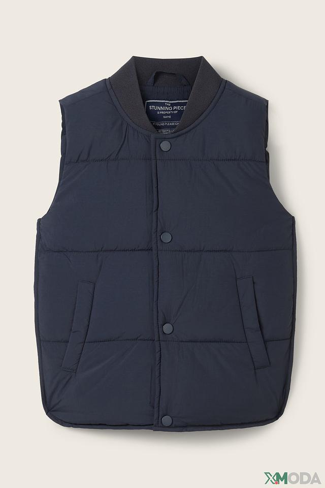 Жилет имеет стеганую фактуру, благодаря чему он хорошо держит форму и обеспечивает дополнительное утепление. Застежка на кнопках позволяет быстро и удобно надевать и снимать жилет. На внутренней стороне расположен ярлычок с надписью “Stunning Piece is property of Name”, что добавляет изделию индивидуальности.