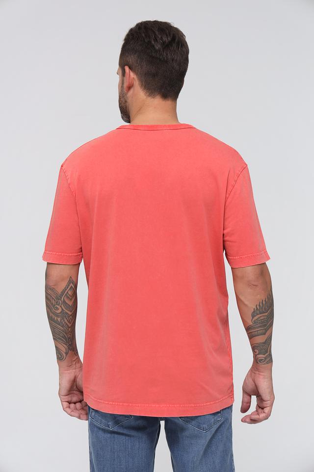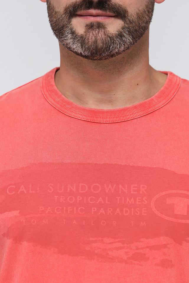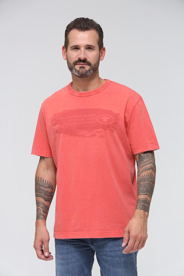 Мужская футболка Tom Tailor кораллового цвета с принтом и эффектом потертости. Изготовлена из 100% хлопка, обеспечивающего комфорт и воздухопроницаемость. Отличный выбор для повседневного образа. Состав: хлопок 100%