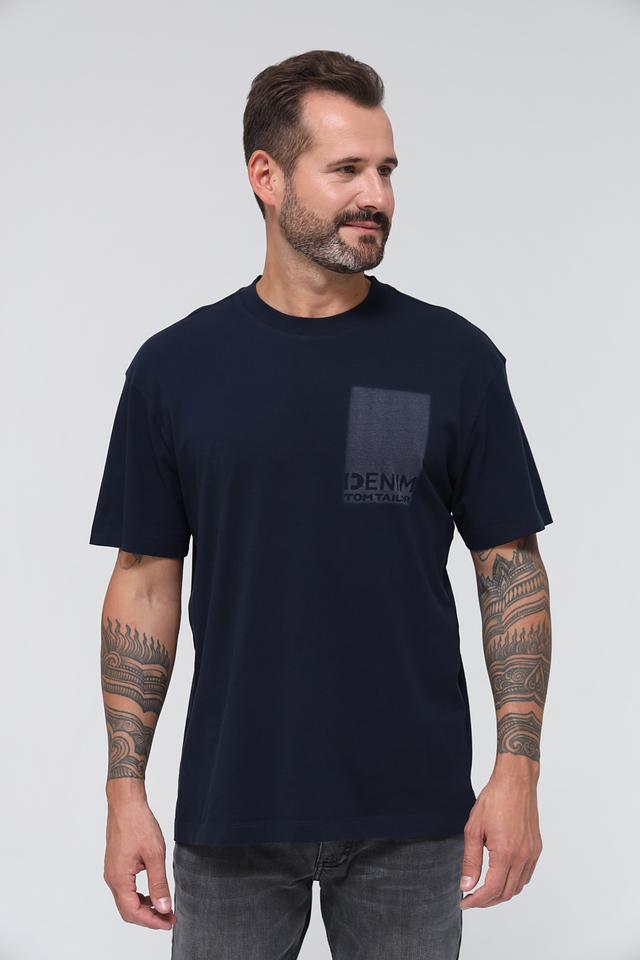 Основной цвет футболки – насыщенный синий. На груди и спине расположен прямоугольный принт с надписью "DENIM TOM TAILOR", выполненный в контрастном сером цвете. Принт добавляет футболке стильный и современный вид.