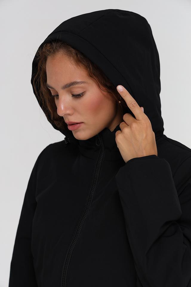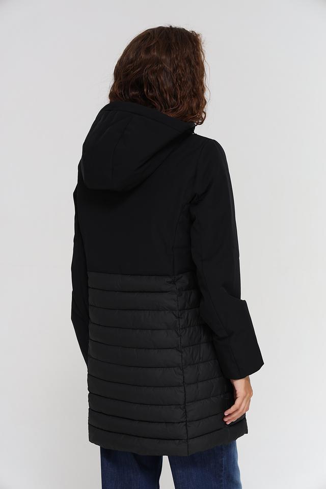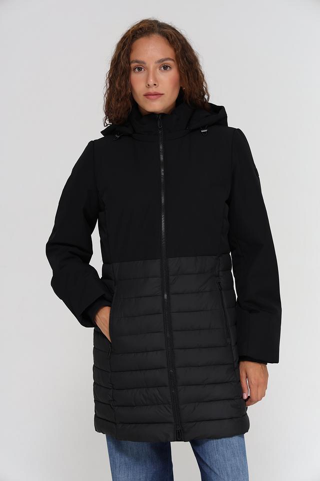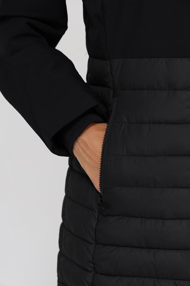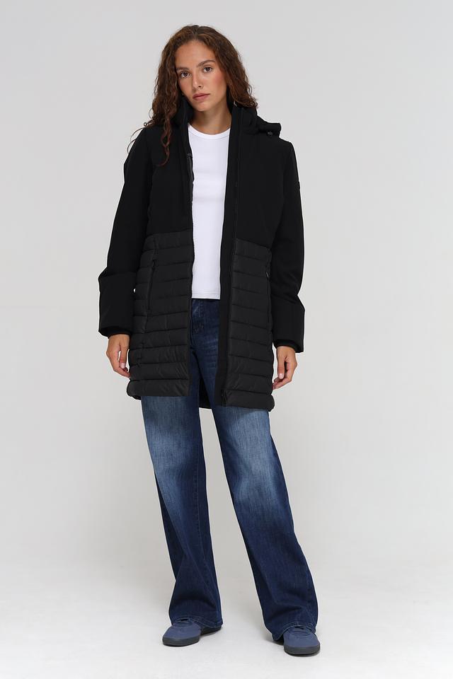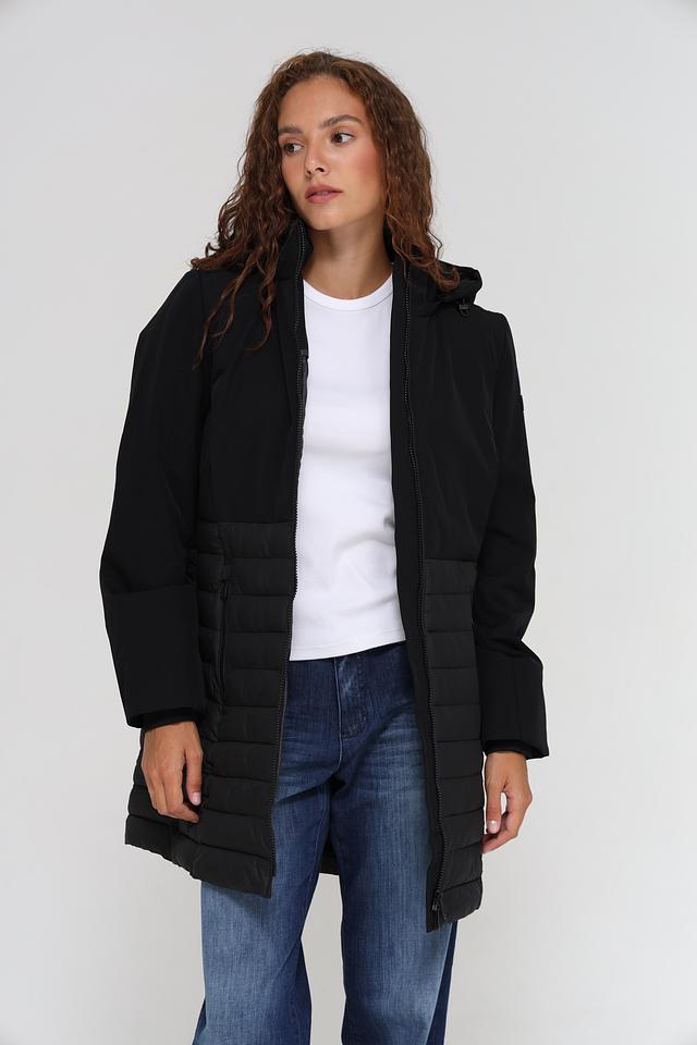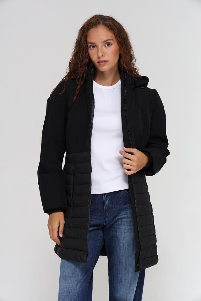 Пальто имеет удобный капюшон, который защитит от непогоды. Застежка-молния позволяет легко регулировать степень теплоизоляции. Верхняя часть и рукава выполнены из гладкой ткани, а нижняя часть – из стеганого полиэстера.