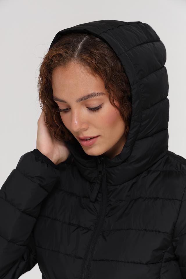 Куртка имеет стеганую текстуру, которая придает ей современный вид и обеспечивает хорошую теплоизоляцию. Капюшон добавляет функциональности и защищает от ветра и небольшого дождя.