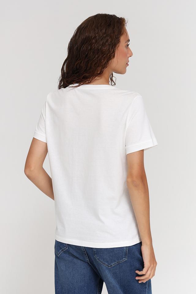Белая футболка Tom Tailor с круглым вырезом и лаконичным принтом. Изготовлена из 100% хлопка, обеспечивающего комфорт и воздухопроницаемость. Стильная и универсальная модель для повседневного образа. Состав: хлопок 100%