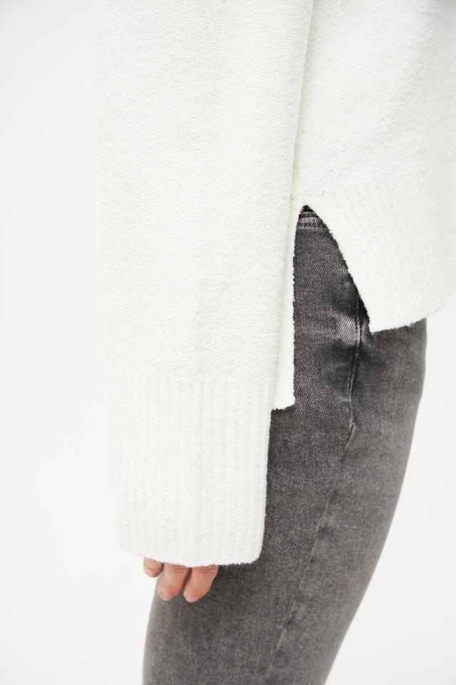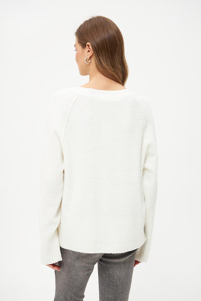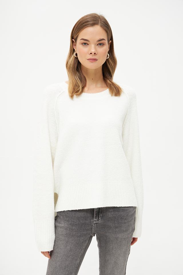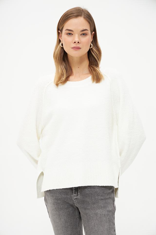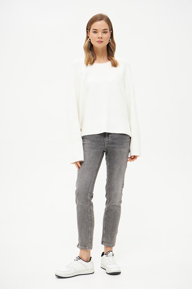 Особенностью модели являются объёмные рукава-колокол, придающие образу женственность и лёгкость. Пуловер имеет круглый вырез горловины и гладкую текстуру.