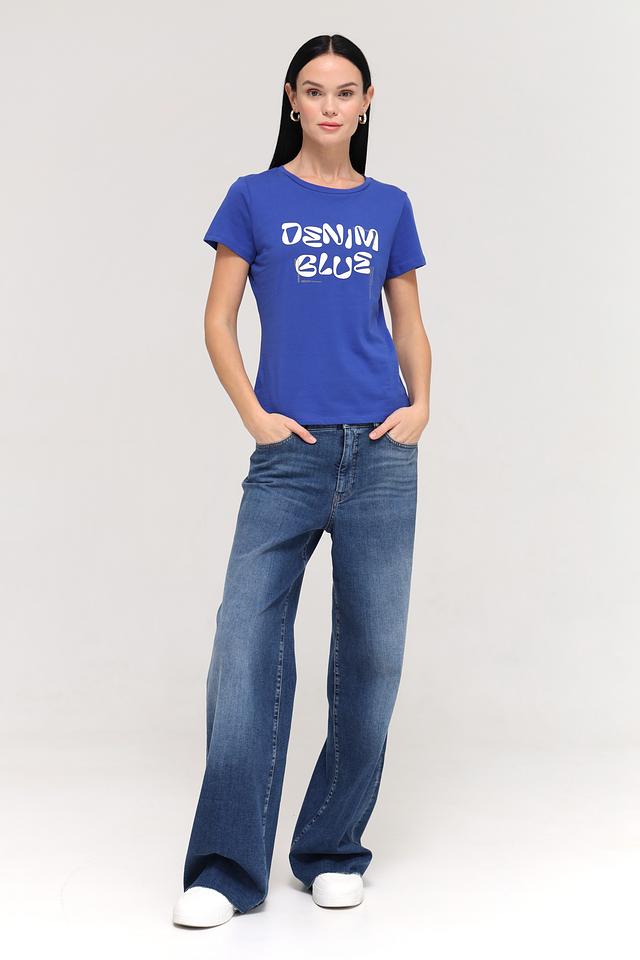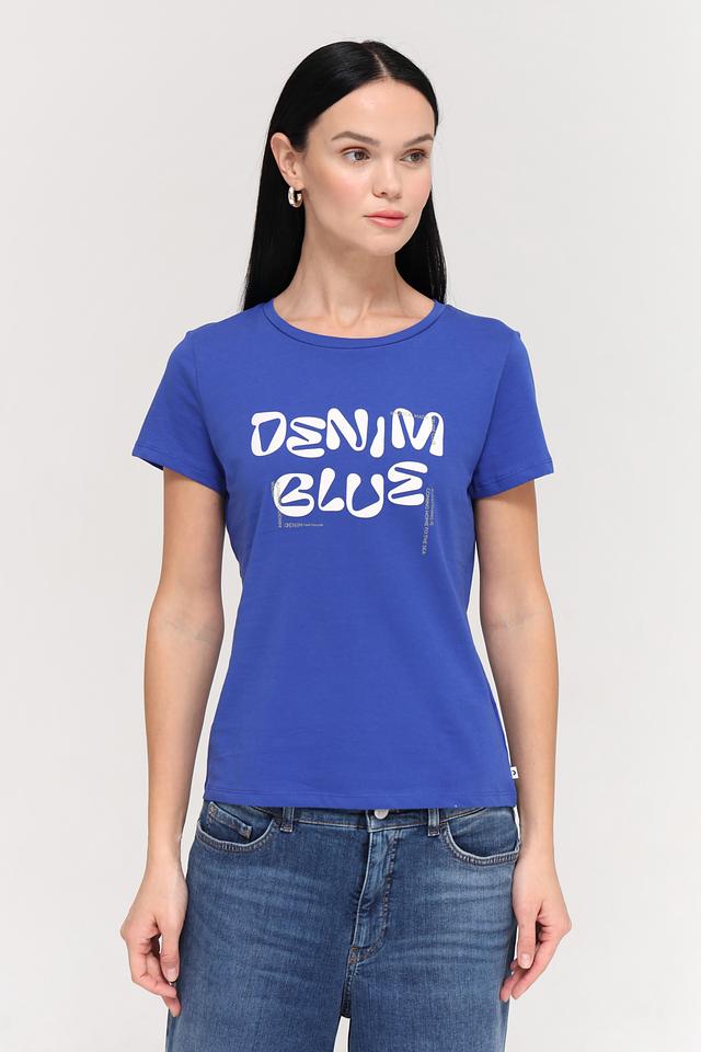 Футболка имеет классический прямой крой и круглый вырез горловины. На передней части изделия расположен крупный белый принт с надписью “DENIM BLUE”, выполненный в оригинальном стиле.