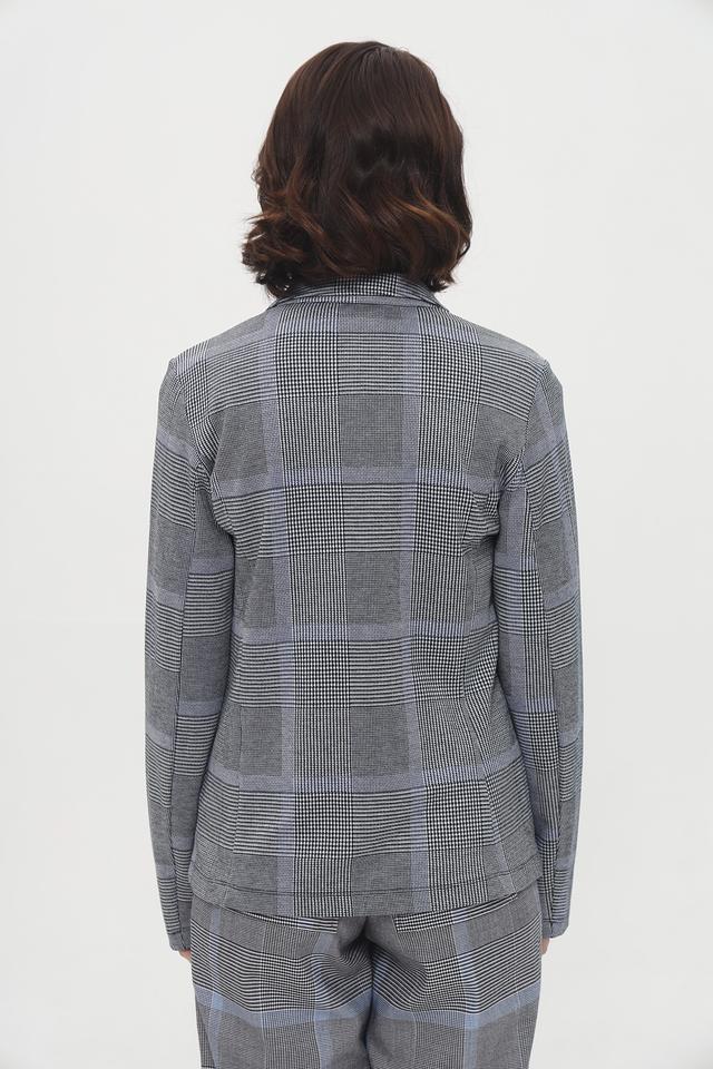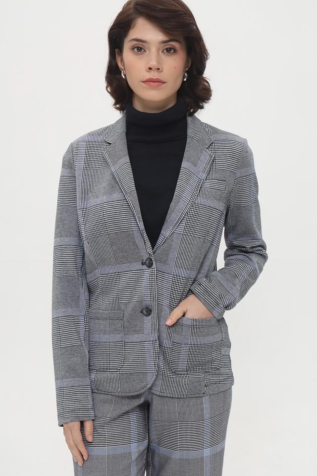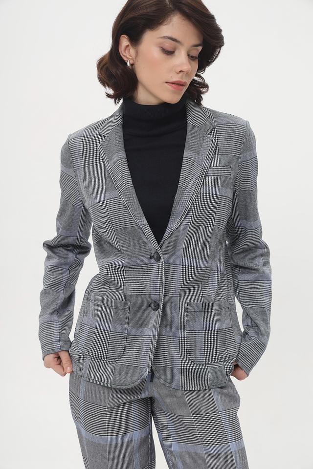 Модель имеет приталенный силуэт, который подчеркивает фигуру. Застежка на пуговицы обеспечивает надежную фиксацию. Жакет имеет стандартную длину и рукава с манжетами.