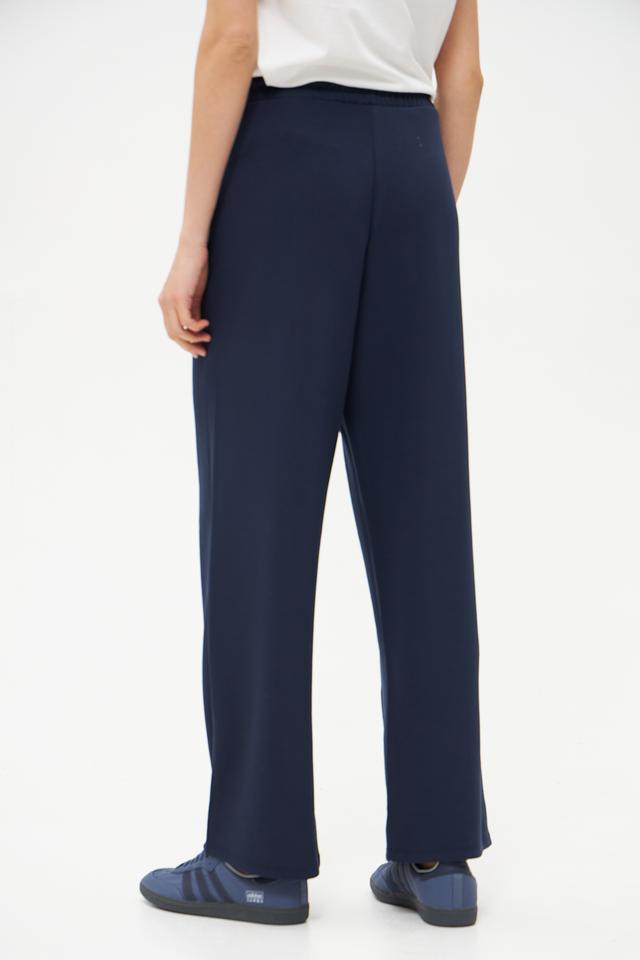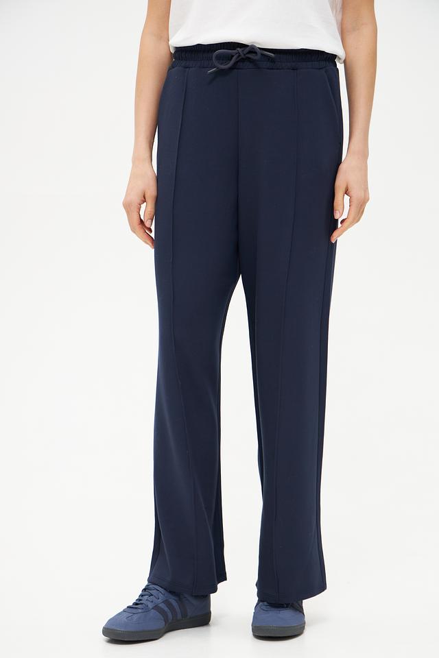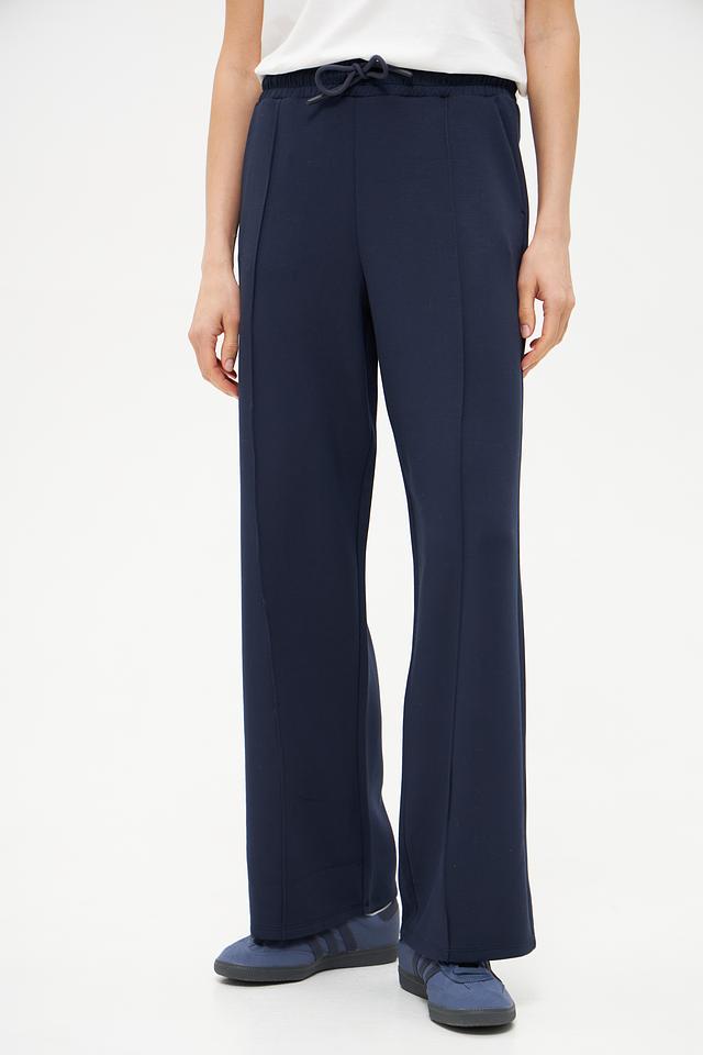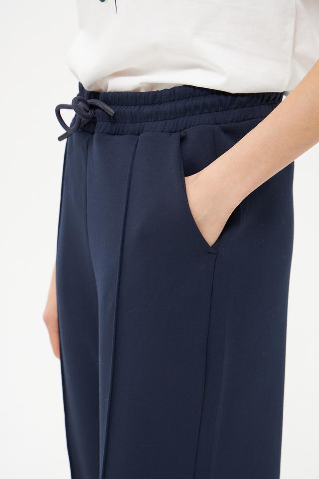 Брюки имеют прямой крой и эластичный пояс с кулиской, что обеспечивает удобную посадку и свободу движений. По бокам расположены функциональные карманы. Материал брюк – сочетание полиэстера, вискозы и эластана, что обеспечивает комфорт в носке и сохранение формы.