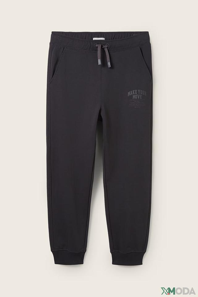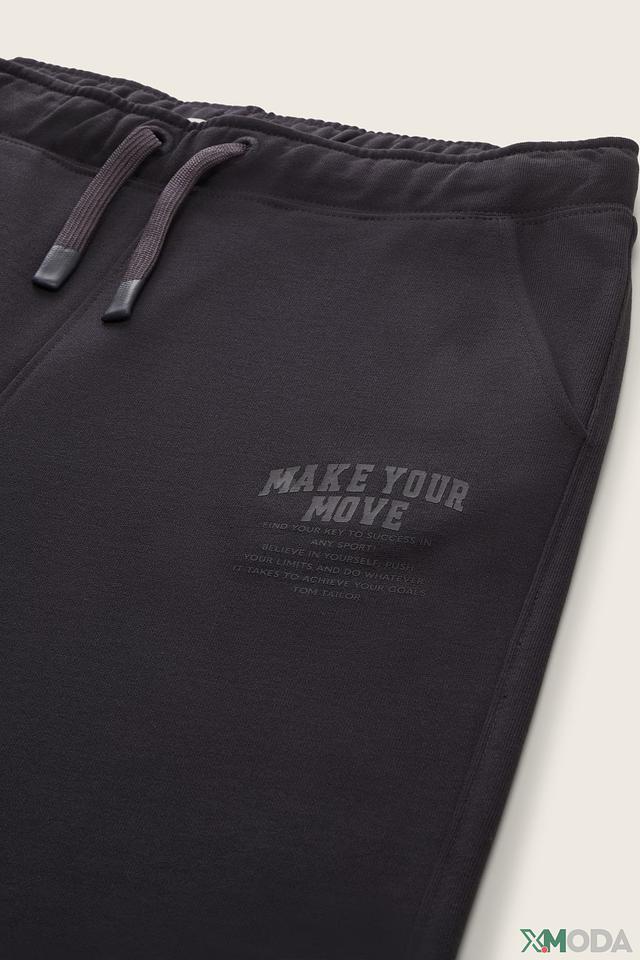 Брюки имеют классический крой с эластичным поясом, который регулируется шнурком для идеальной посадки. По бокам расположены удобные карманы. На левой штанине имеется декоративная надпись "MAKE YOUR MOVE" и логотип бренда.
